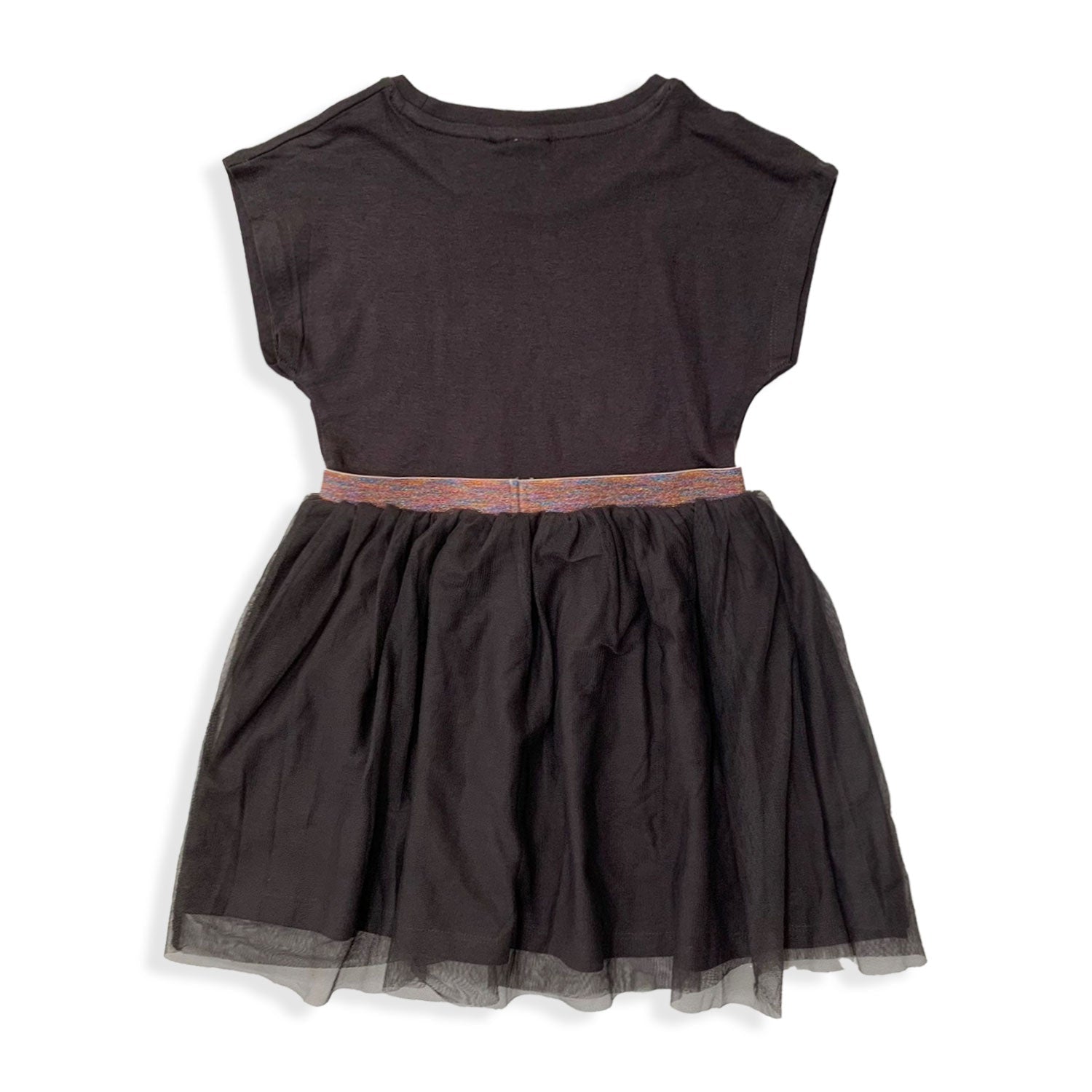 Abito mezze maniche con stampa sul davanti e inserti in glitter, elastico in vita lurex e gonna in tulle.
