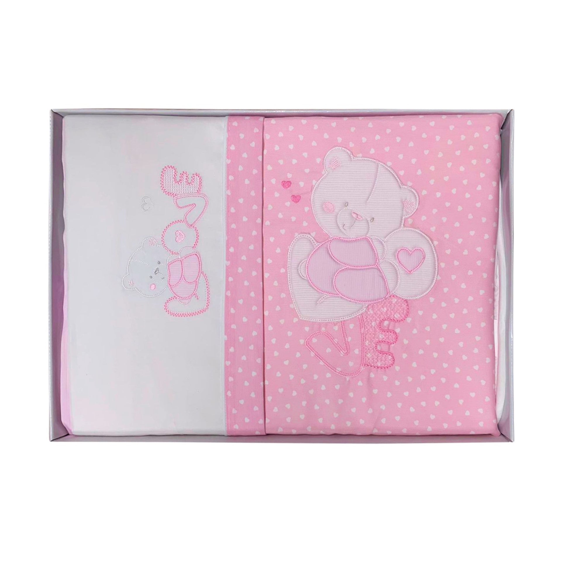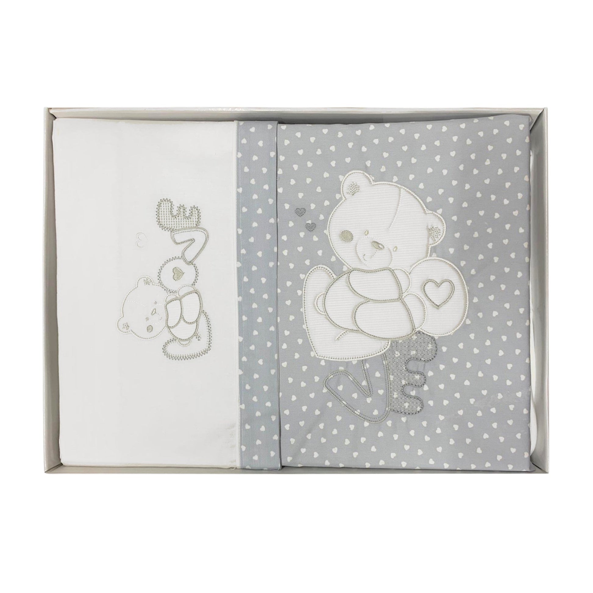 Completo Lenzuola in 100% Cotone per culla/carrozzina con ricami e applicazioni.
