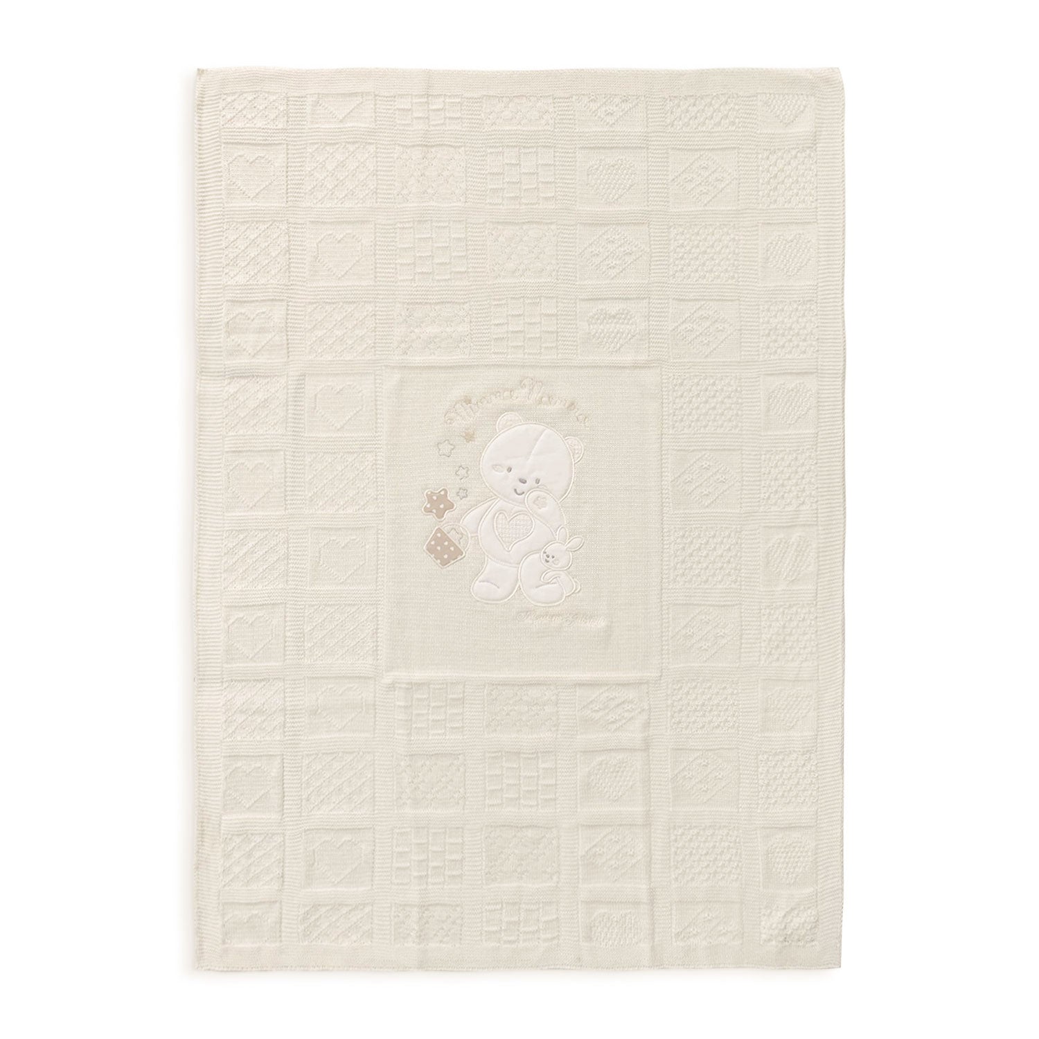 Copertina culla Nazareno Gabrielli smacchinata in filo con ricamo orsetti.