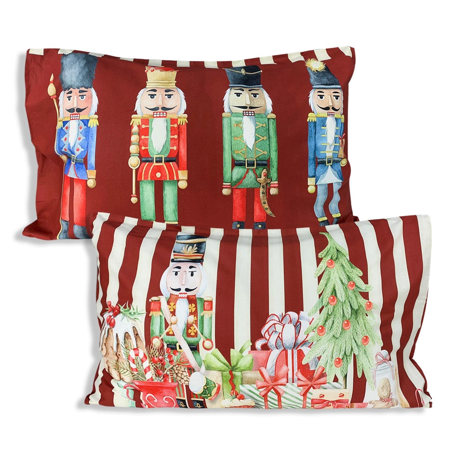 Entrambe le federe sono stampate, una unita raffigurante gli schiaccianoci e l'altra rigata con uno schiaccianoci e decori natalizi.
