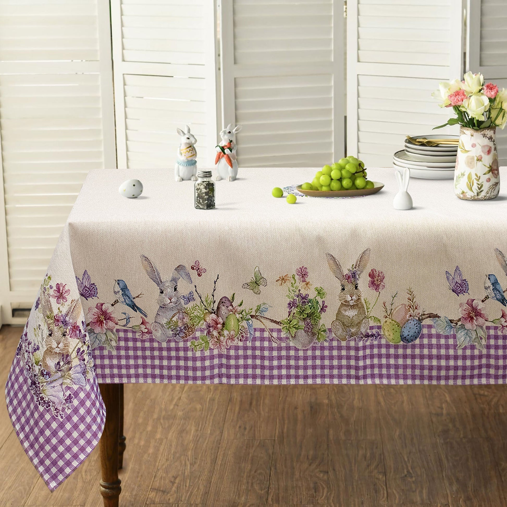 Porta l’atmosfera della primavera e della Pasqua sulla tua tavola con questo elegante copritavolo pasquale in gobelin. Realizzato con cura artigianale, presenta un delicato motivo vichy impreziosito da conigli, uova, fiori, farfalle e uccellini, che evocano la gioia e i colori della stagione.