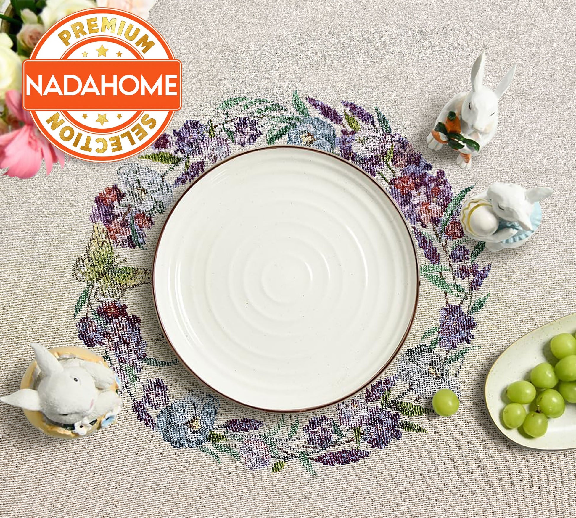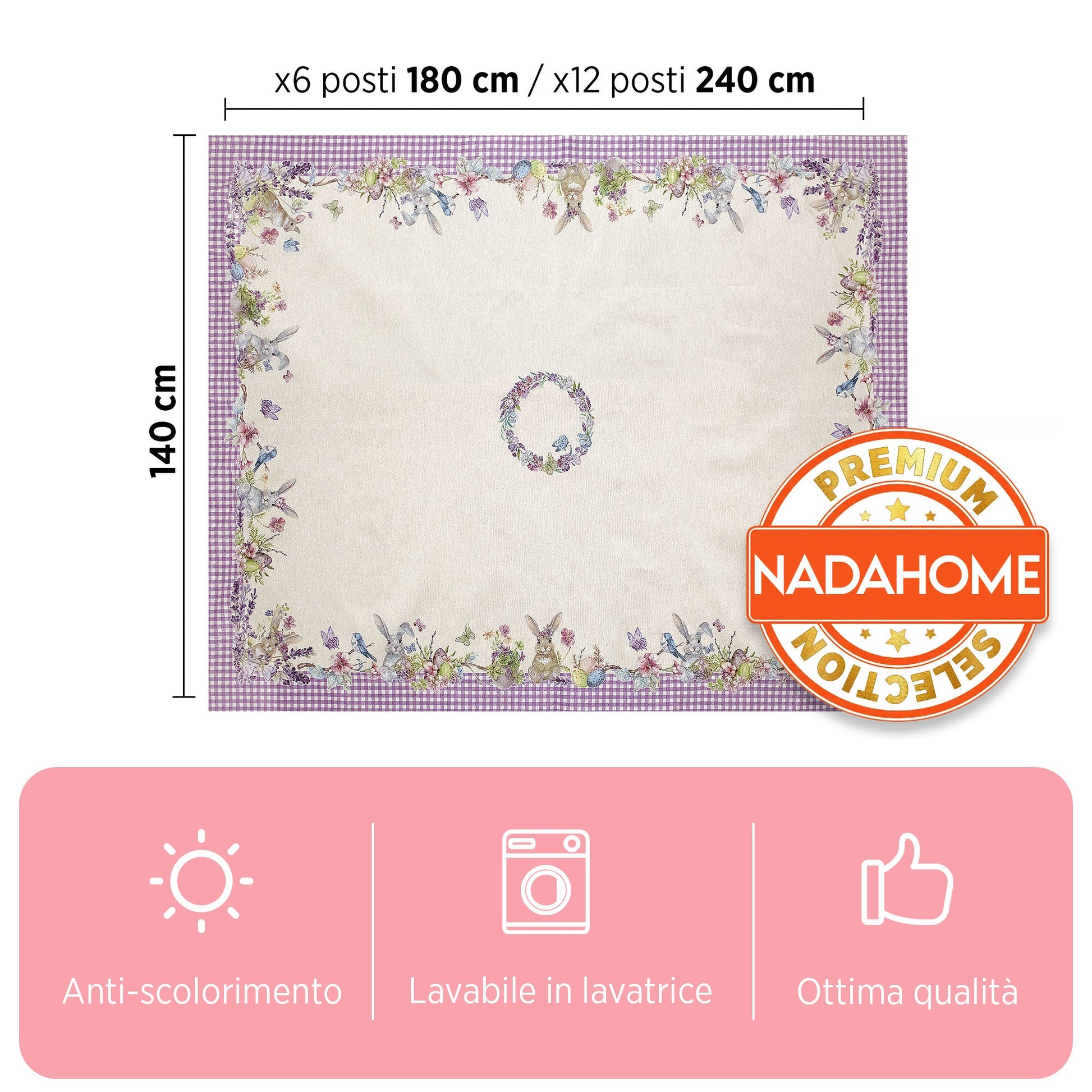 Al centro della tovaglia spicca una ghirlanda di fiori, armoniosamente coordinata al motivo floreale circostante, per un design raffinato e accattivante. Perfetto per decorare la tua tavola durante le festività pasquali o per dare un tocco primaverile alla tua casa.