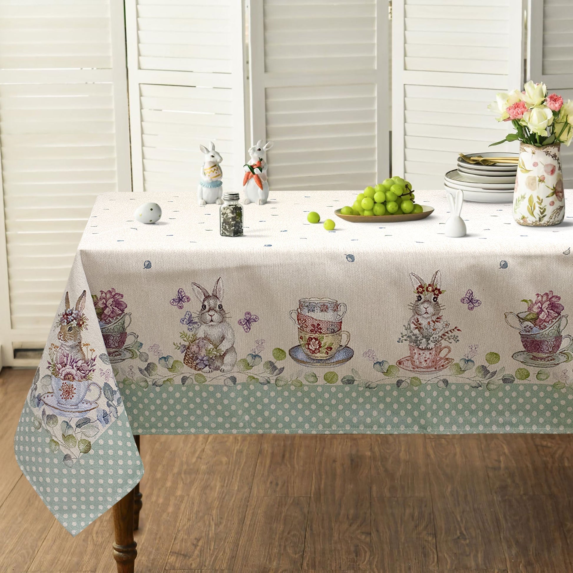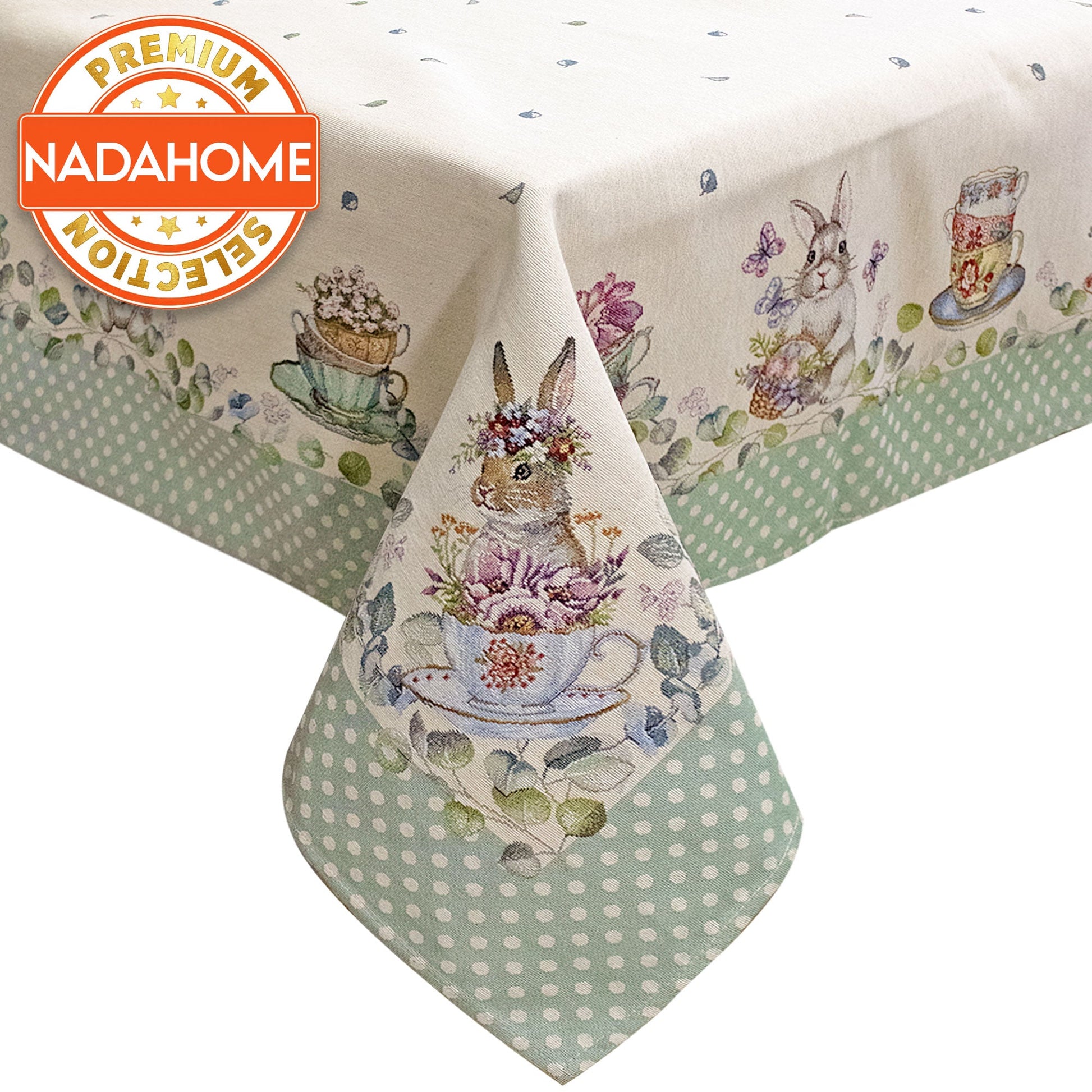 Porta l’atmosfera della primavera e della Pasqua sulla tua tavola con questo elegante copritavolo pasquale in gobelin. Realizzato con cura artigianale, presenta un delicato motivo pois impreziosito da conigli in tazze, fiori, farfalle e foglie, che evocano la gioia e i colori della stagione.
