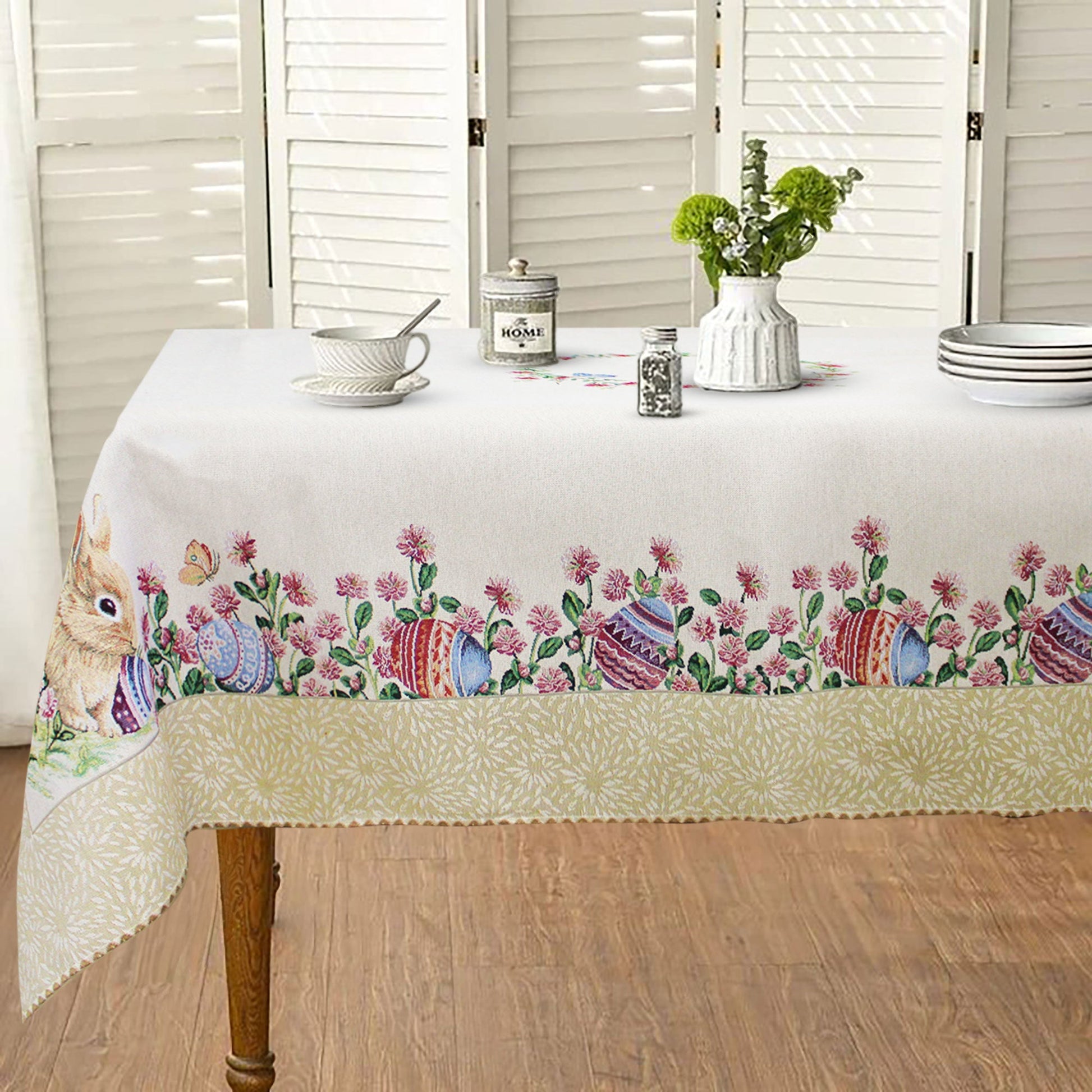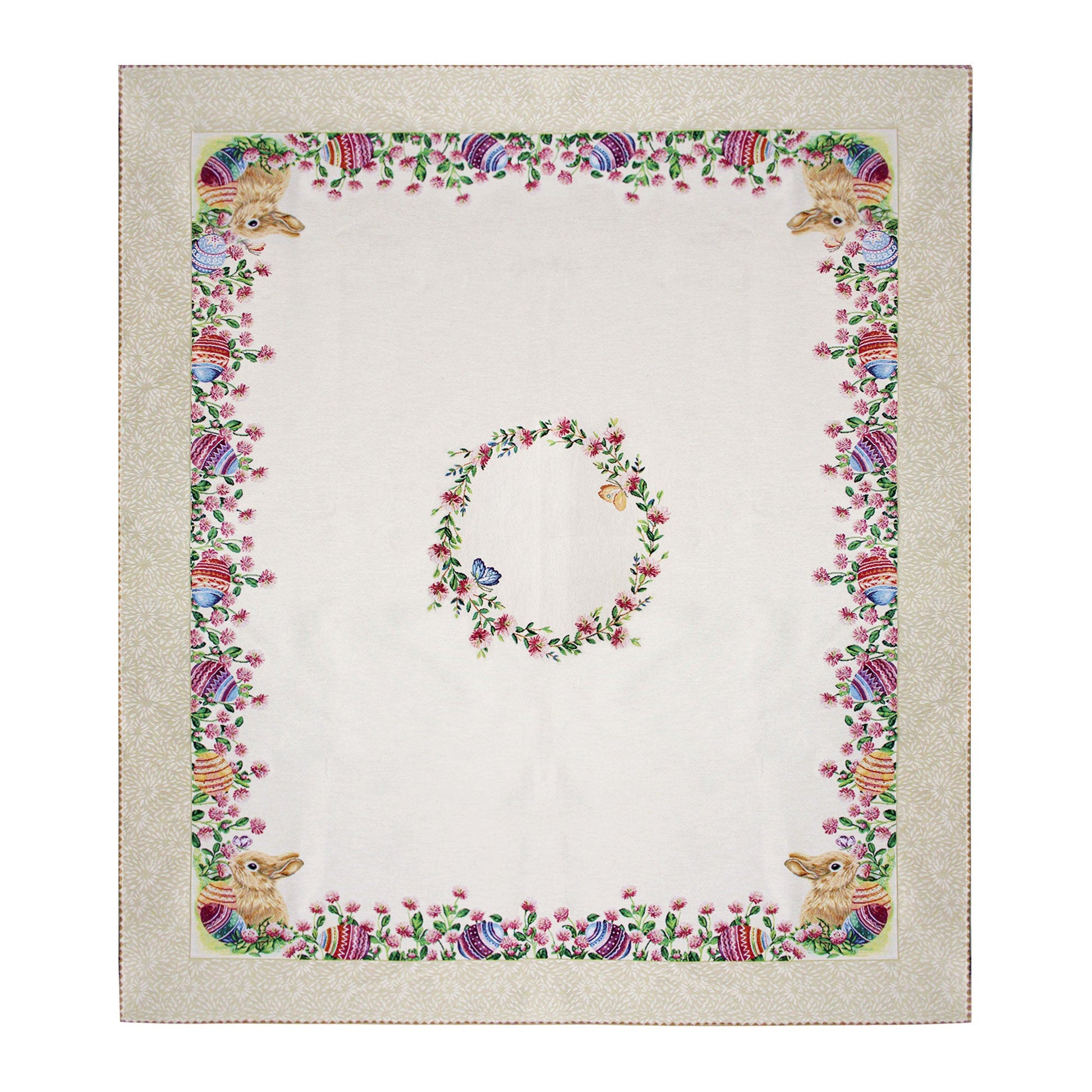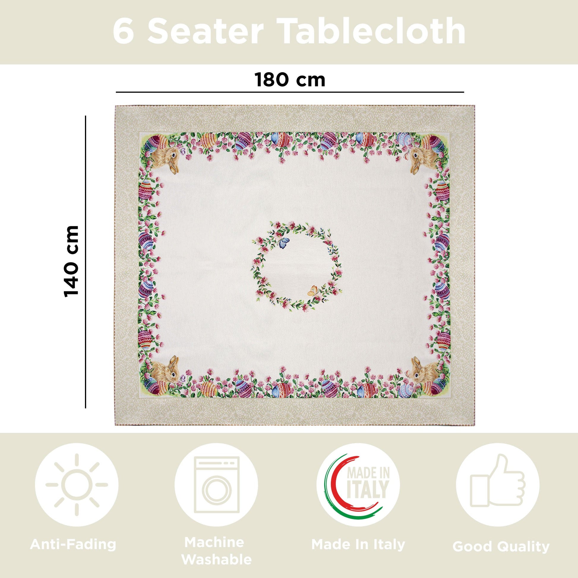 La fantasia incantevole con al centro una corona di fiori e farfalle e tutto intorno conigli giocosi, fiori e uova pasquali aggiunge un tocco festivo e unico alla tua tavola. Con dimensioni generose di 140x180cm, si adatta perfettamente a tavole da 6 posti, trasformando ogni pasto in un'occasione speciale.