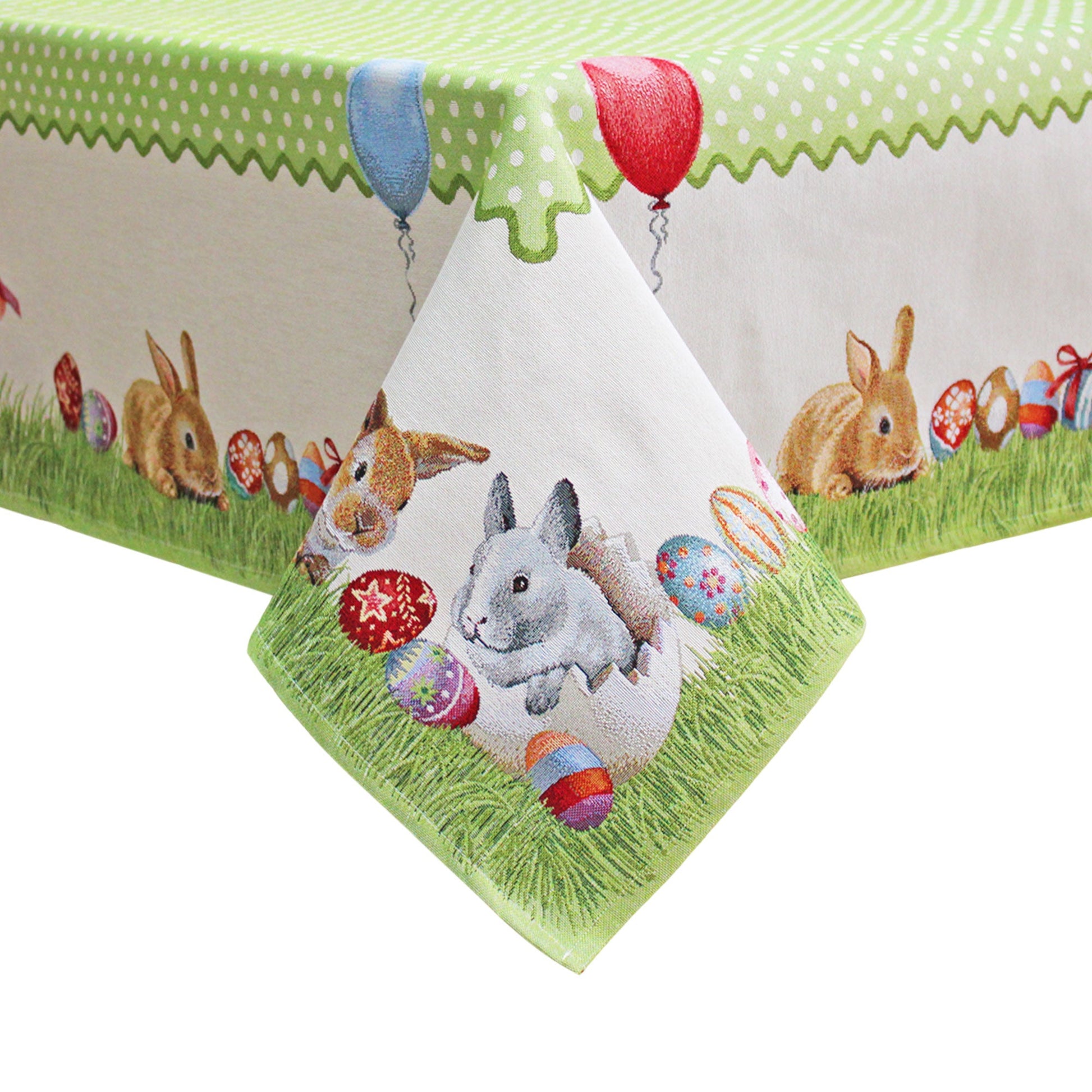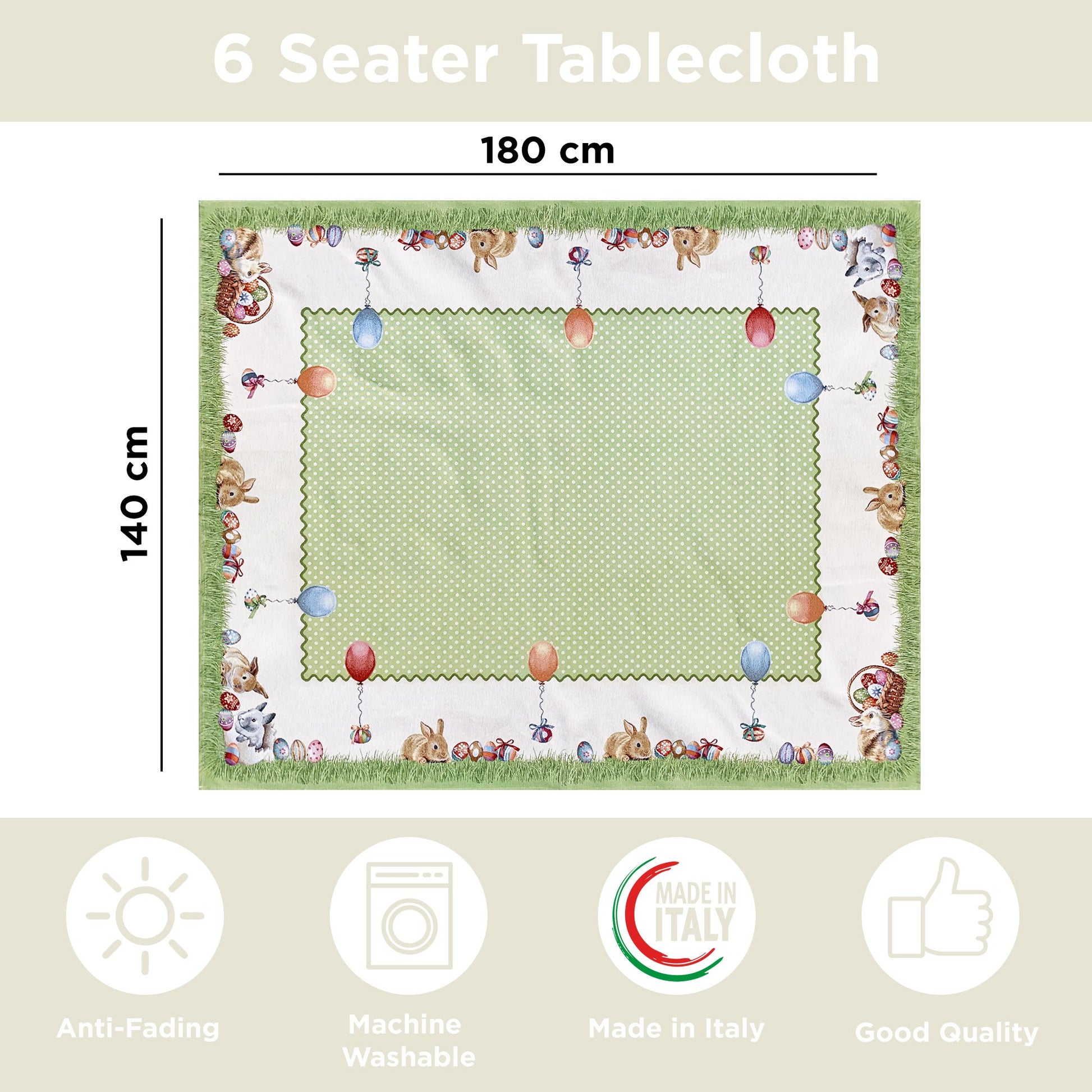 La fantasia incantevole con al centro motivo a pois e intorno conigli giocosi, palloncini e cesti di uova pasquali aggiunge un tocco festivo e unico alla tua tavola. Con dimensioni generose di 140x180cm, si adatta perfettamente a tavole da 6 posti, trasformando ogni pasto in un'occasione speciale.
