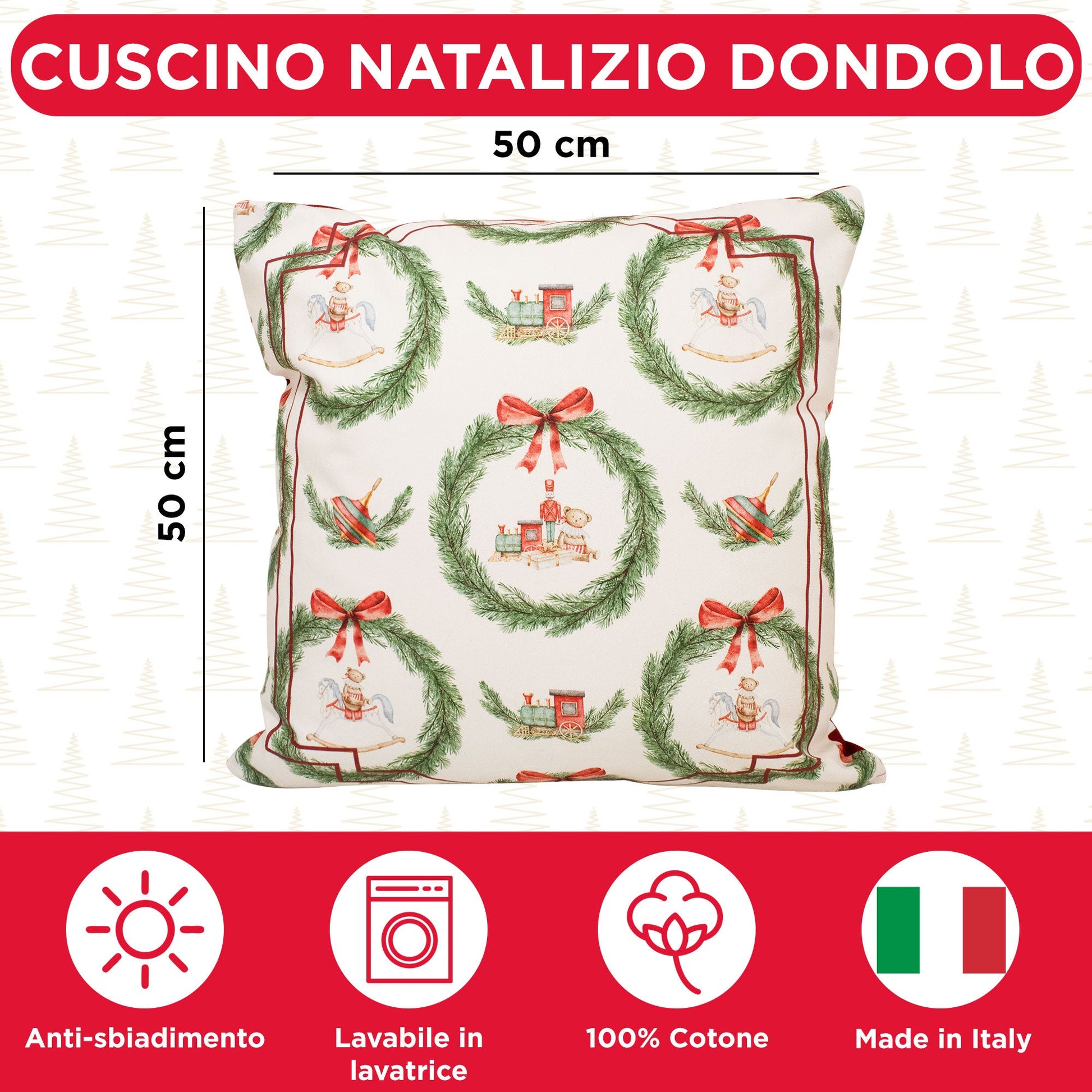 Porta la magia del Natale nella tua casa con il cuscino arredo Dondolo, realizzato in 100% puro cotone. Il suo motivo festivo, arricchito da ghirlande di abete, fiocchi e dolci dondoli d’epoca, dona un tocco caldo e accogliente a ogni ambiente.