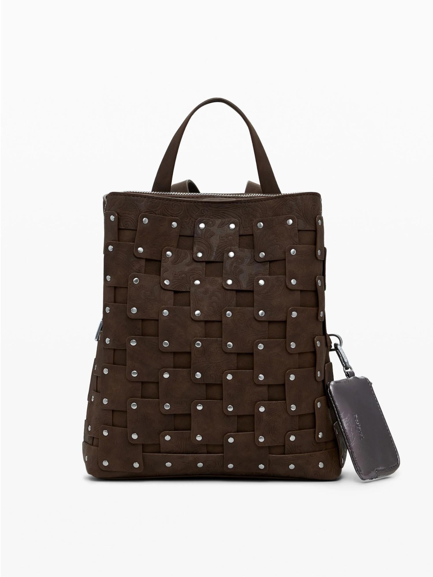 Zaino medio in effetto pelle composto da molteplici patch quadrati, con finitura di borchie metalliche e portachiavi con portamonete effetto pelle metallizzato rimovibile. Effetto patch. Dettagli di borchie metalliche. Tasca posteriore esterna. Chiusura con cerniera. Vari scomparti interni. Dettaglio del logo in applicazione metallica. Portachiavi con portamonete estraibile. Capacità: 9,4 l. Effetto pelle con finitura effetto camoscio. Progettato a Barcellona. Misure: 26,70 x 10,20 x 34,50 cm. Composizione esterna: 100% Poliuretano. Composizione interna: 100% Poliestere. Trimming fabric material: 100% Poliuretano.