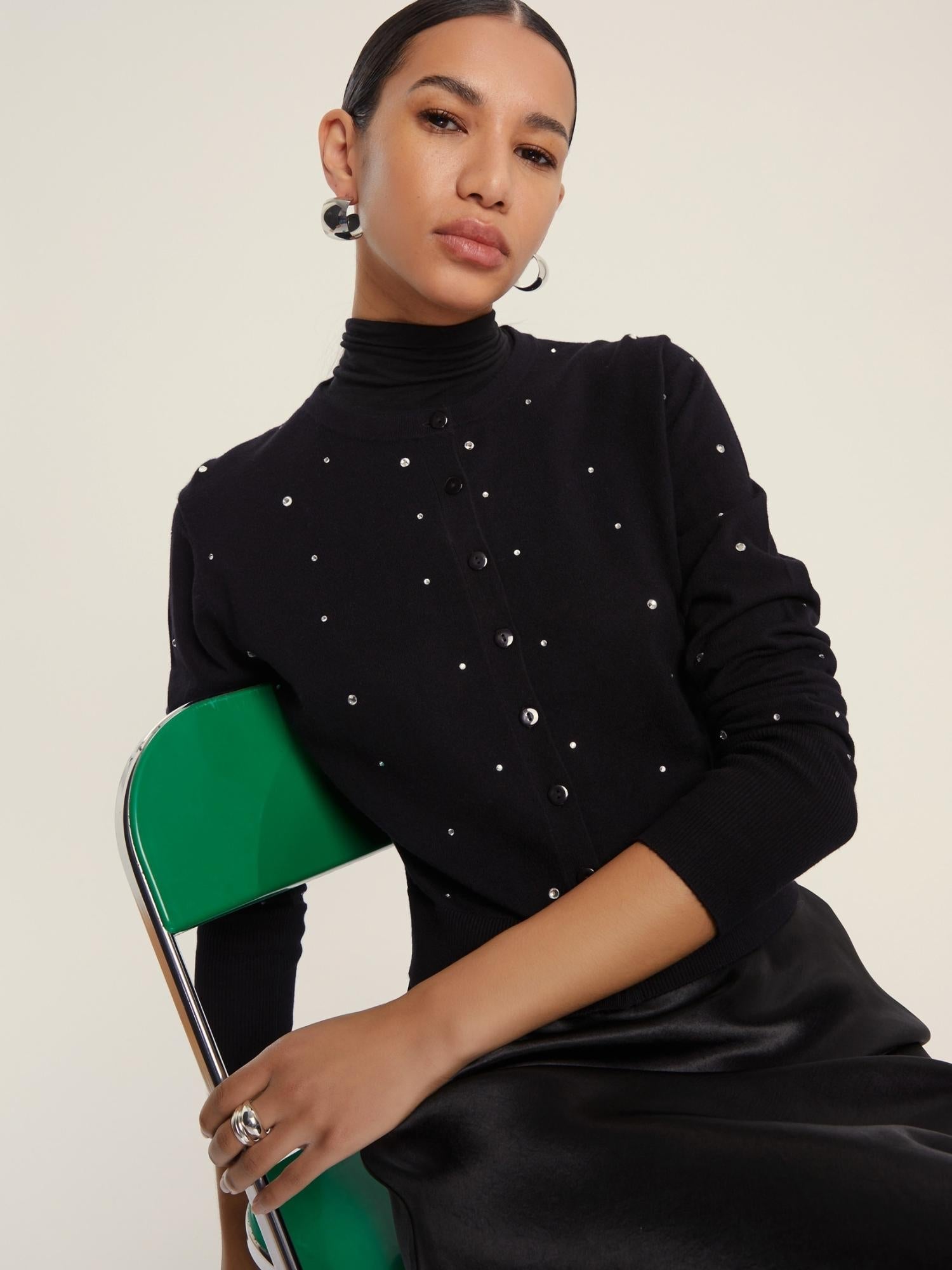 L'allure lady like del cardigan trova nuova energia in questa versione con cristalli applicati. Per brillare di glamour, giorno dopo giorno. Cardigan in filato di misto viscosa stretch. Fit dritto, leggermente cropped in vita. Scollo a giro. Dettagli di cristalli bidimensionali applicati sul davanti e sulle maniche. Polsi e fondo capo rifiniti con costine. Filato in maglia: 70% Viscosa, 30% Poliammide. Decorazioni escluse.