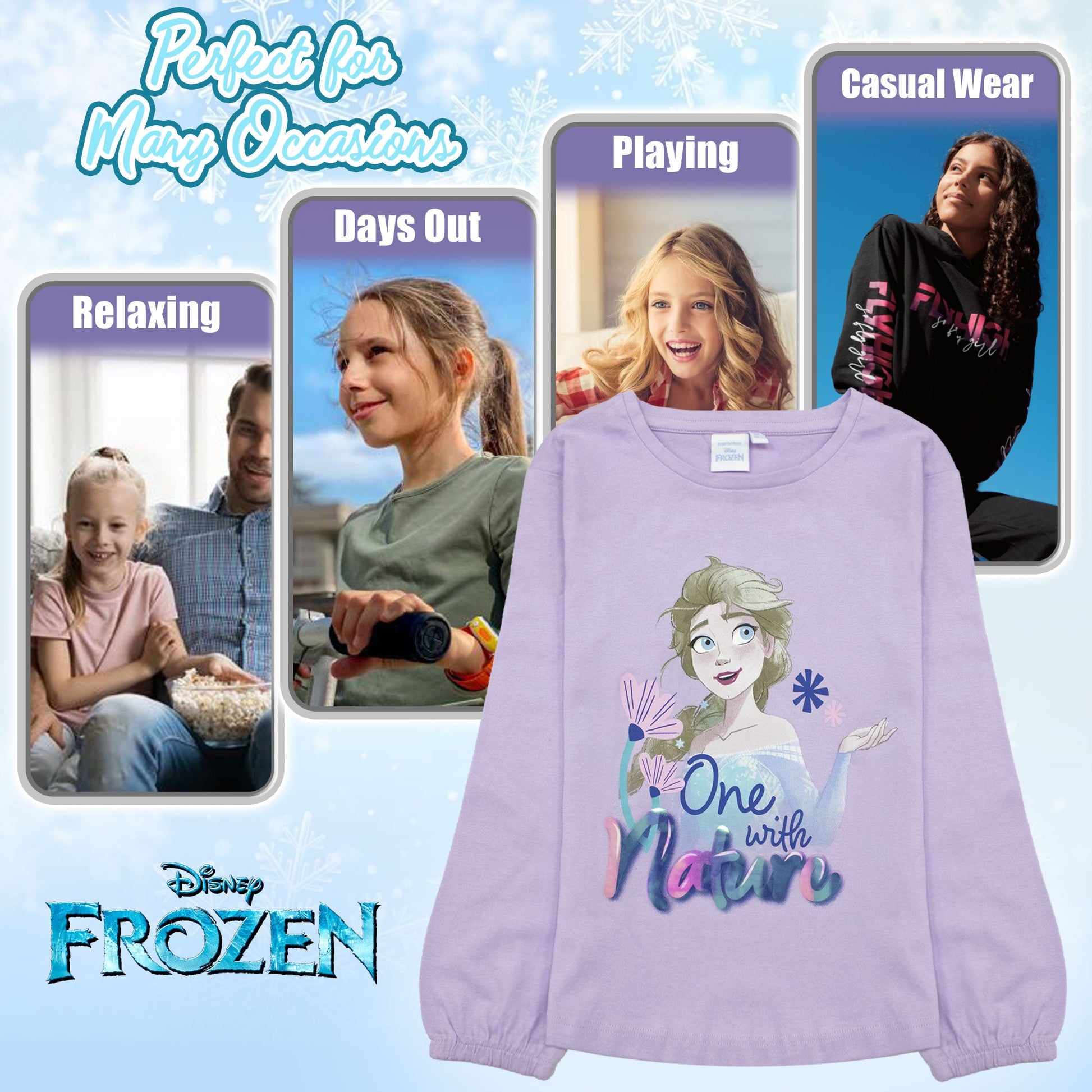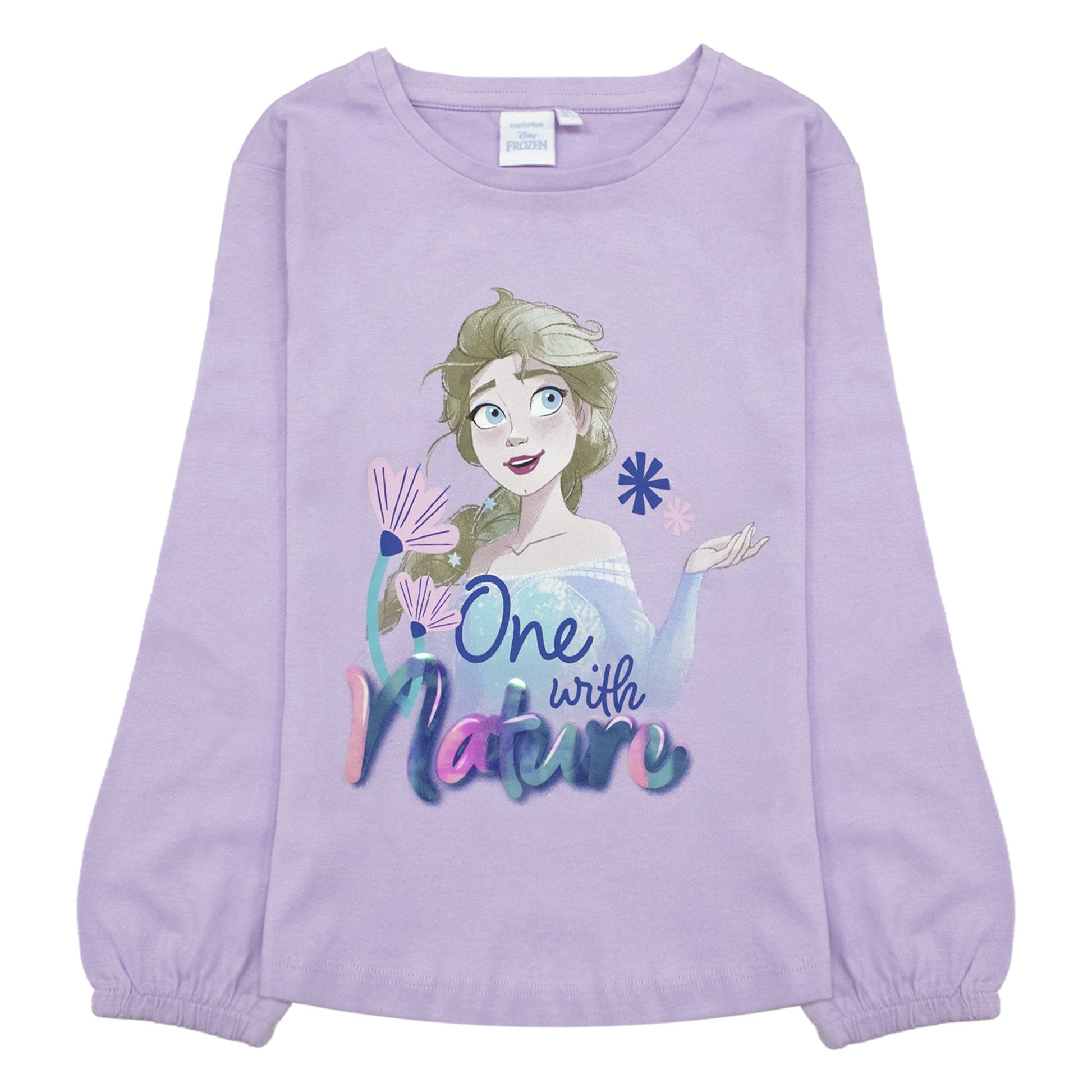 Il design esclusivo presenta la dolce Elsa sul davanti, accompagnata dalla scritta "One with Nature" con una brillante stampa laminata che aggiunge un tocco di magia e luminosità al look. Le maniche a sbuffo con elastico ai polsi donano un tocco elegante e femminile, trasformando ogni outfit in una vera e propria dichiarazione di stile.