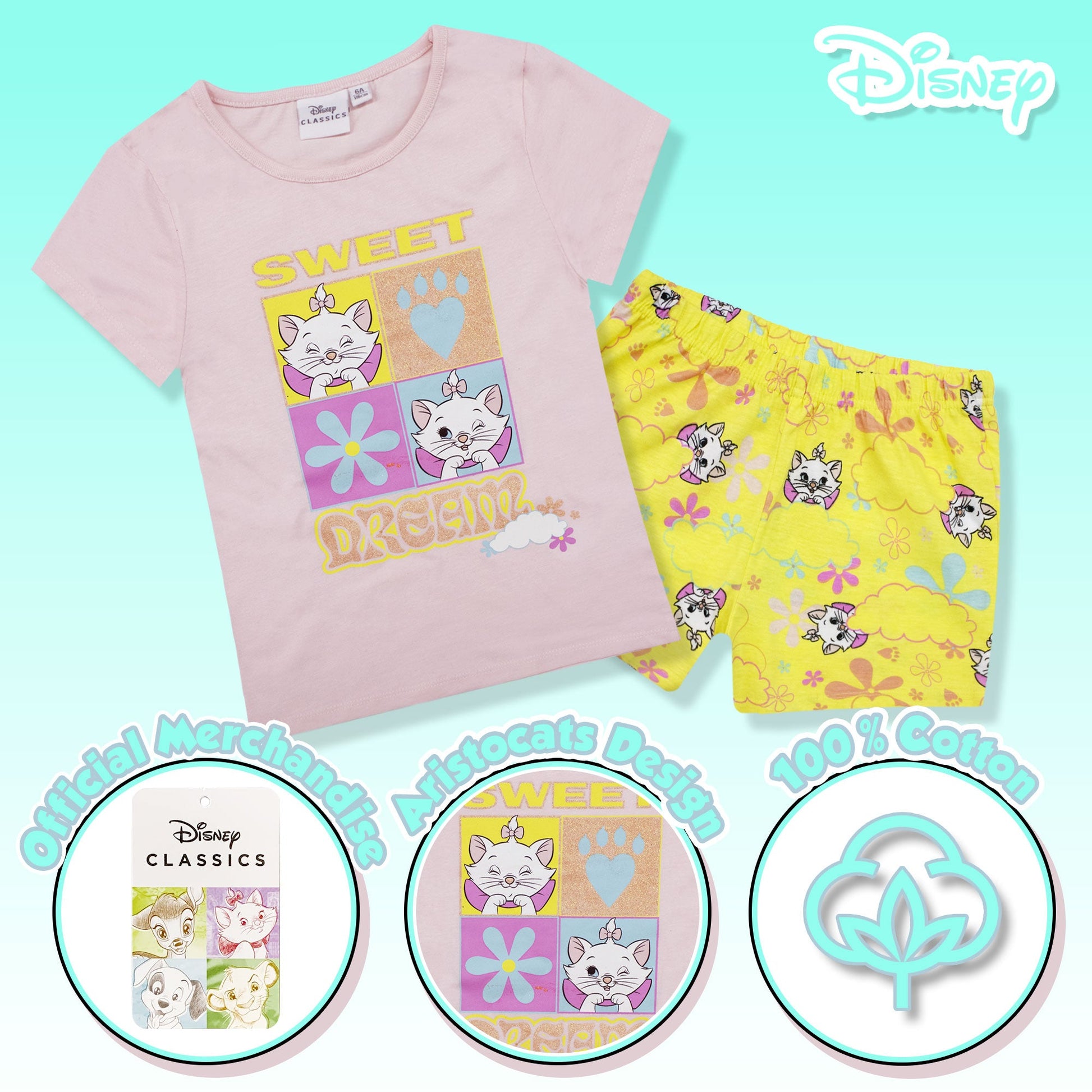 Coccola la tua piccola principessa con il pigiama ispirato agli Aristogatti, un capolavoro Disney che incanta generazioni! Questo delizioso set comprende una t-shirt e un pantaloncino, entrambi realizzati al 100% in jersey di cotone leggero per garantire il massimo comfort durante il sonno.
