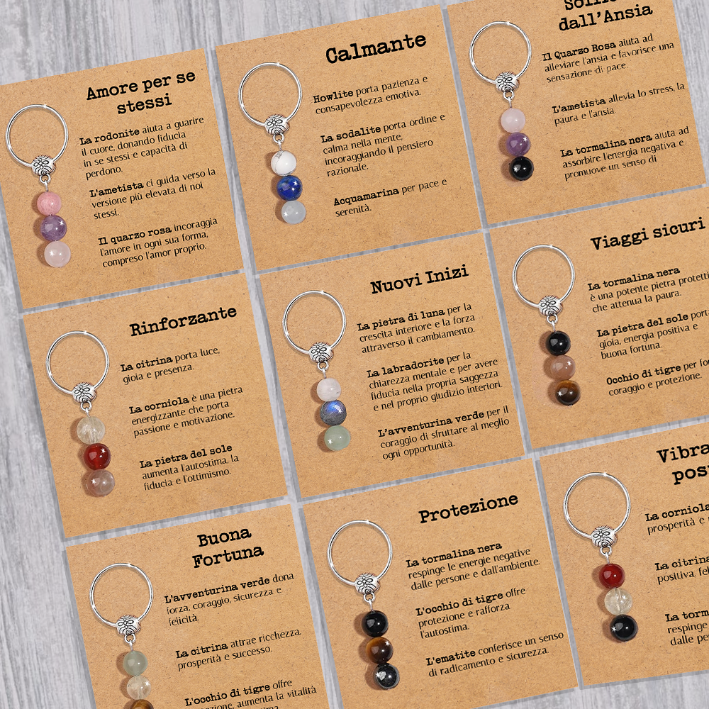- Ogni portachiavi include un piccolo cartoncino con il significato del cristallo scelto