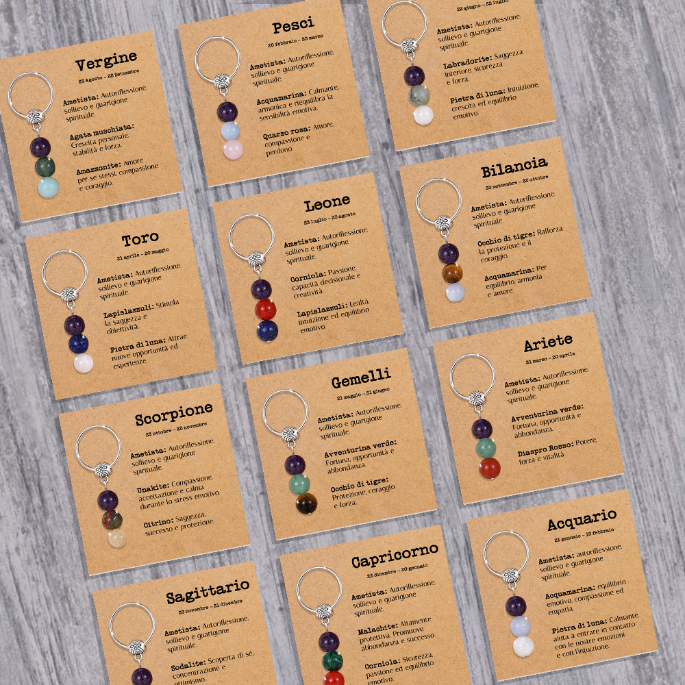 Ogni portachiavi è realizzato a mano e abbinato a 3 cristalli scelti con cura per armonizzare le energie tipiche di ciascun segno.