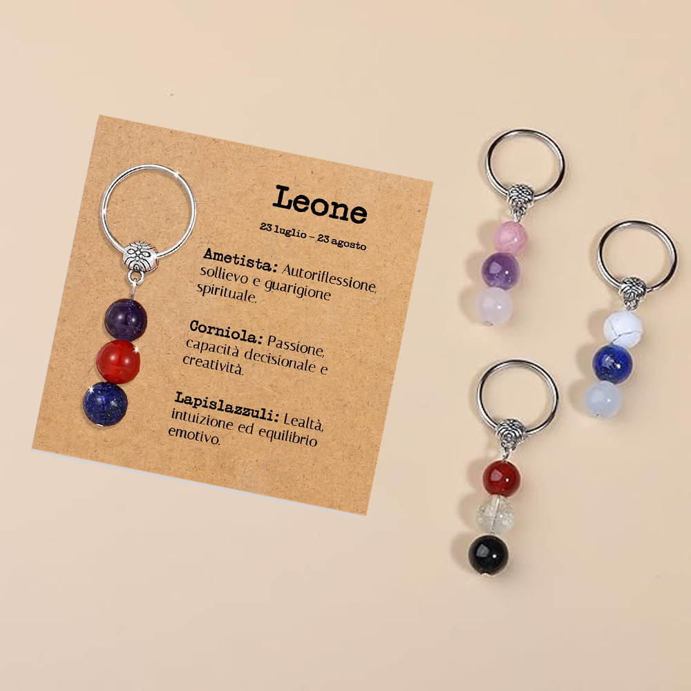 Ogni portachiavi è realizzato a mano e abbinato a 3 cristalli scelti con cura per armonizzare le energie tipiche di ciascun segno.