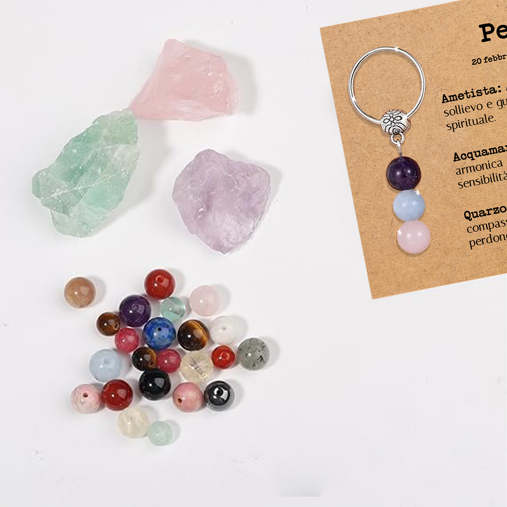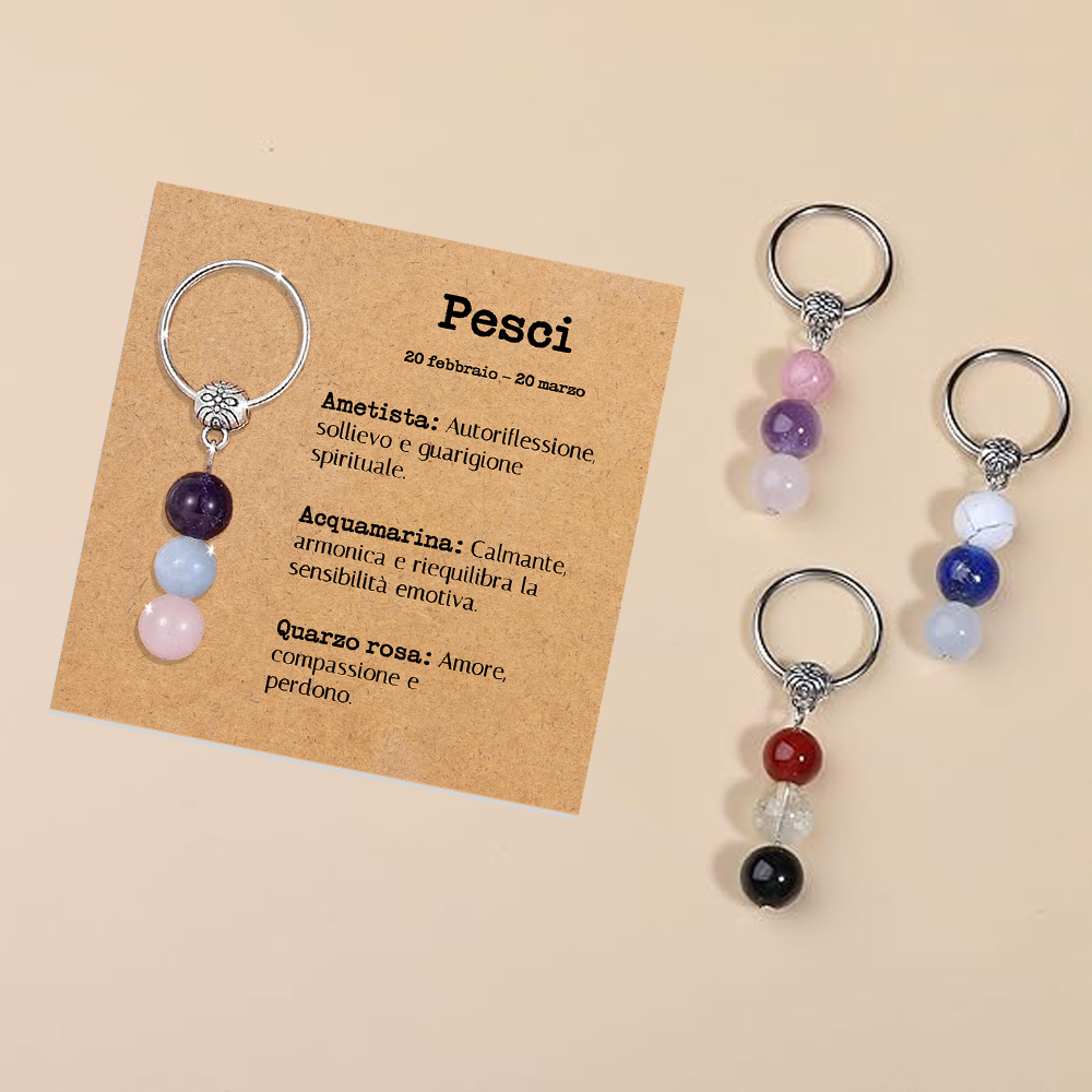 Ogni portachiavi è realizzato a mano e abbinato a 3 cristalli scelti con cura per armonizzare le energie tipiche di ciascun segno.