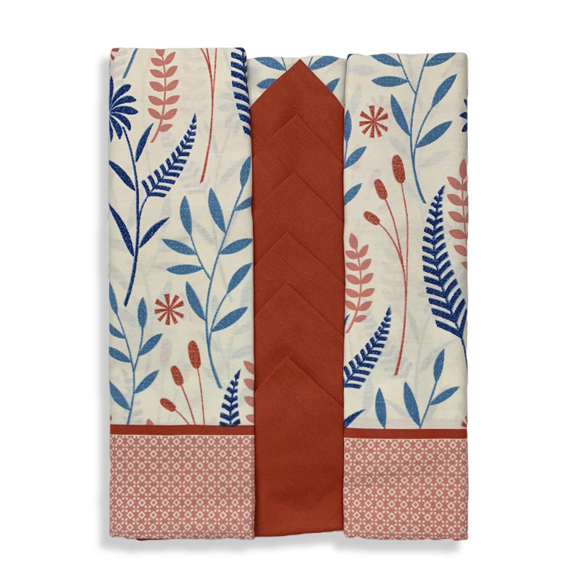 La tovaglia è in panama stampata con tovaglioli in tinta unita.
