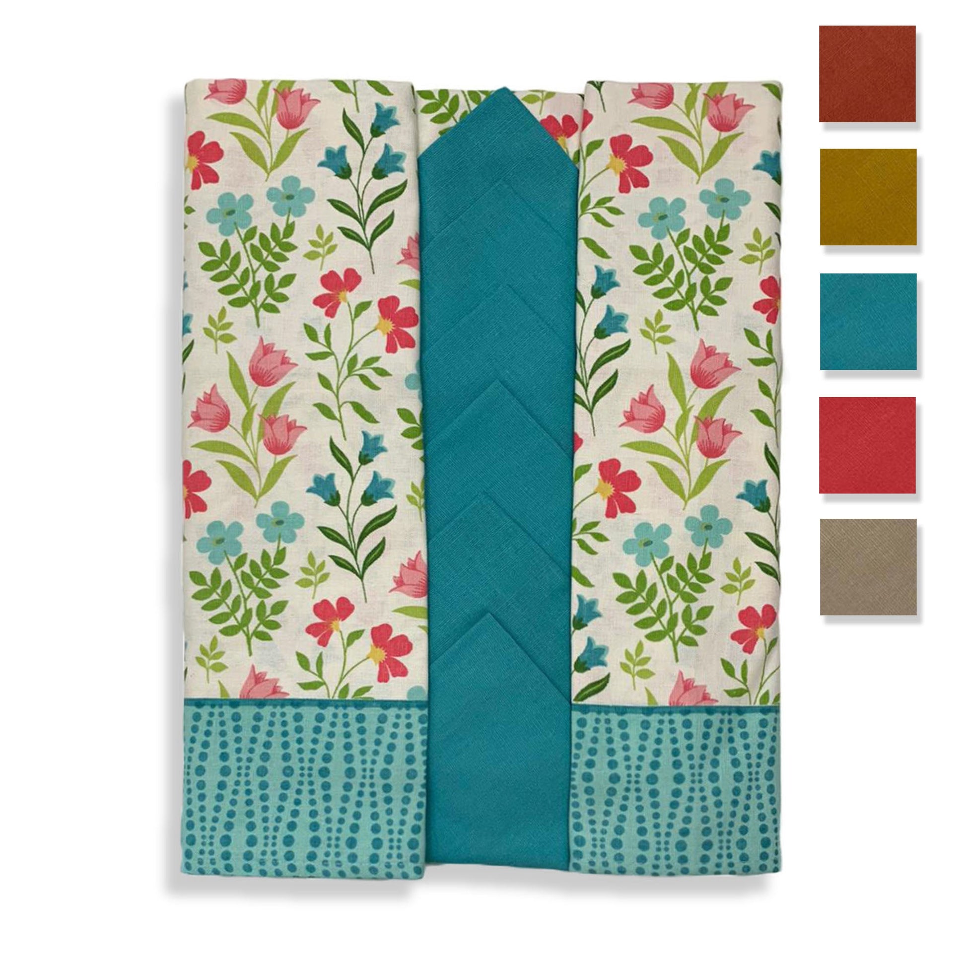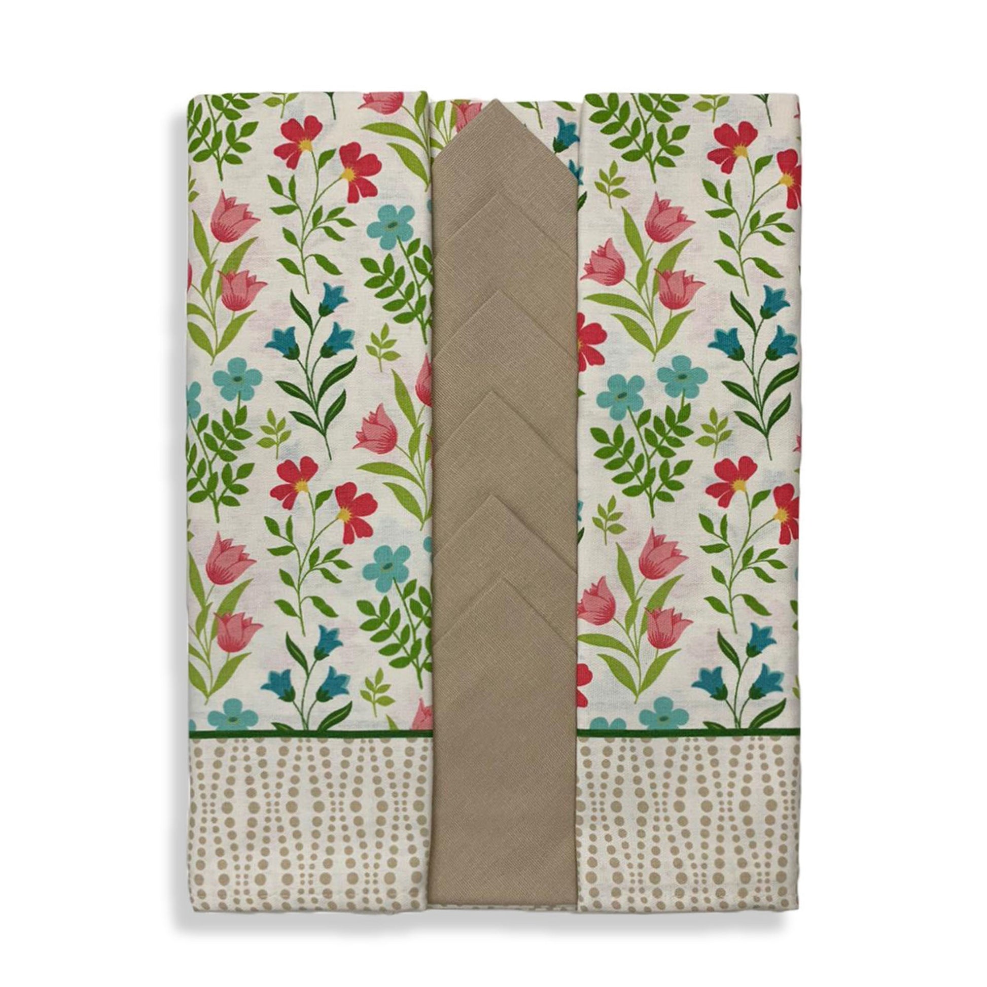 La tovaglia è in panama stampata con tovaglioli in tinta unita.
