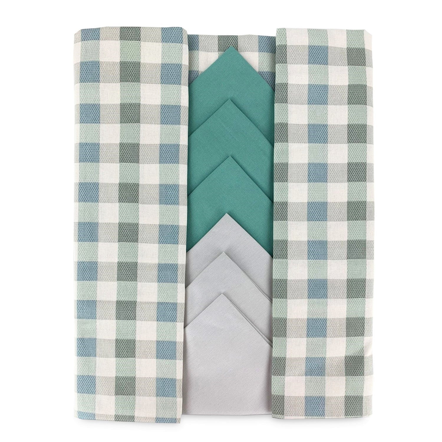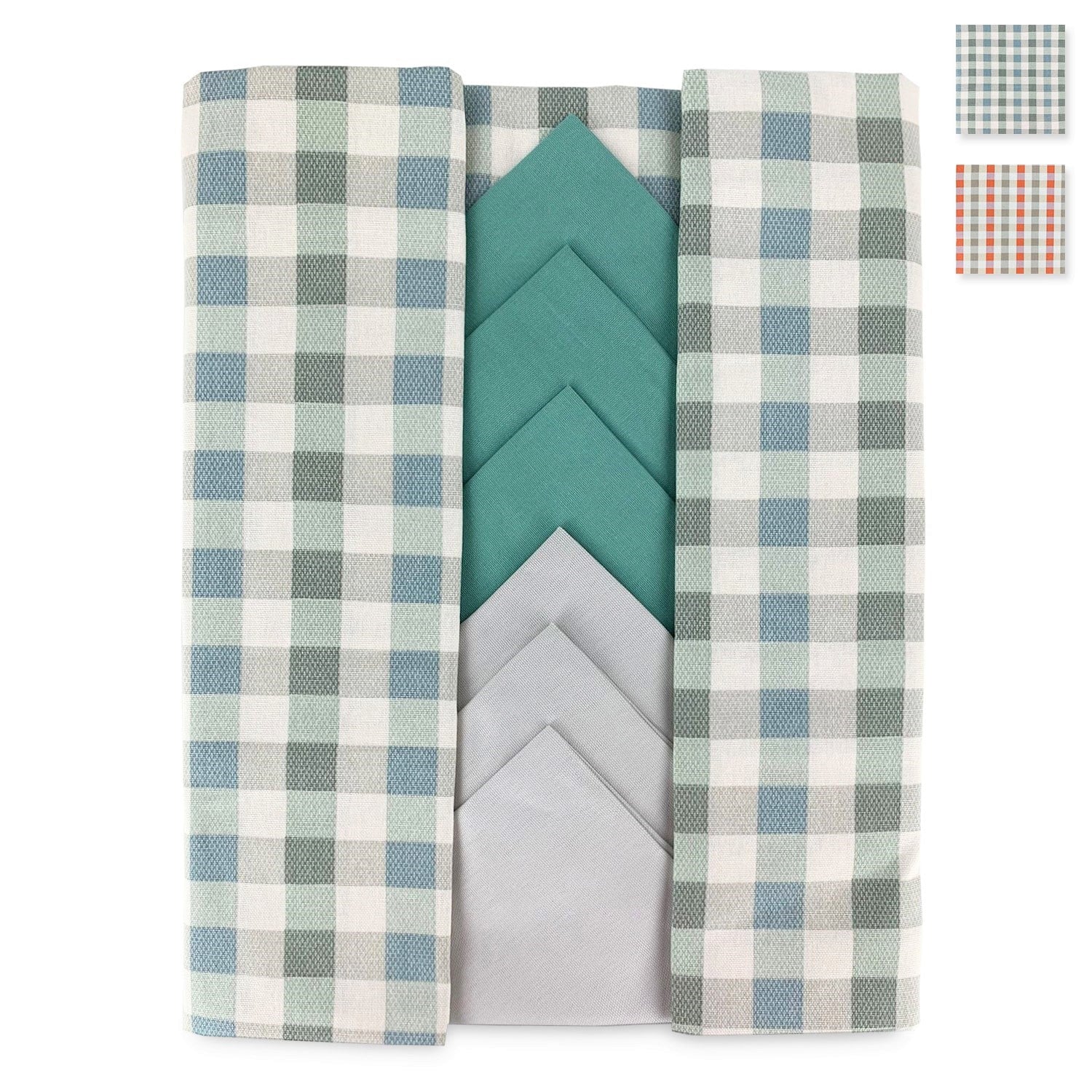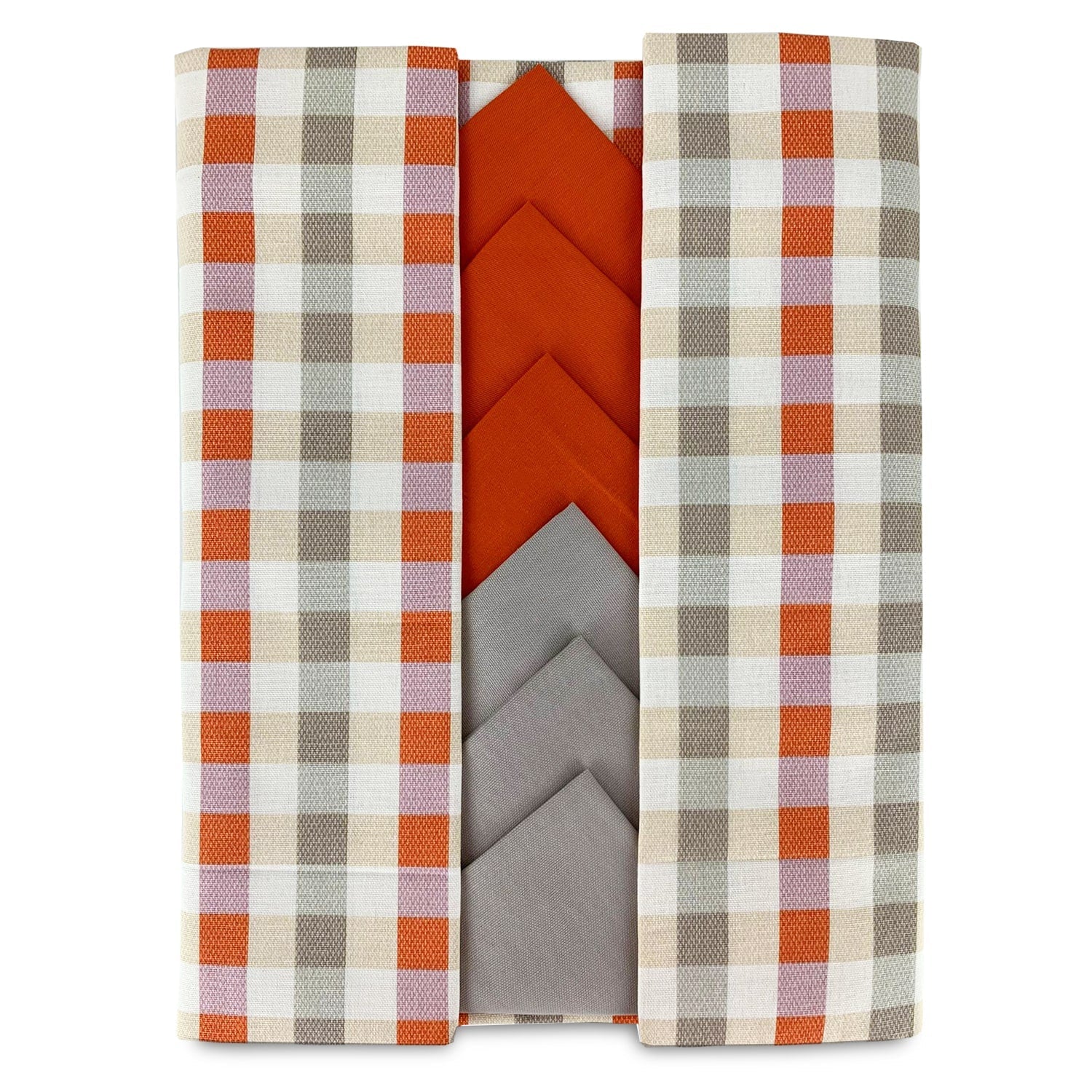 La tovaglia è in cotone stampato con tovaglioli in tinta unita.