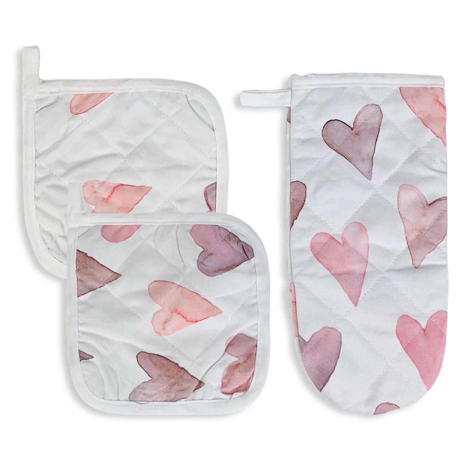 Set 3 pezzi guanto da forno e presine da cucina con stampa cuori.