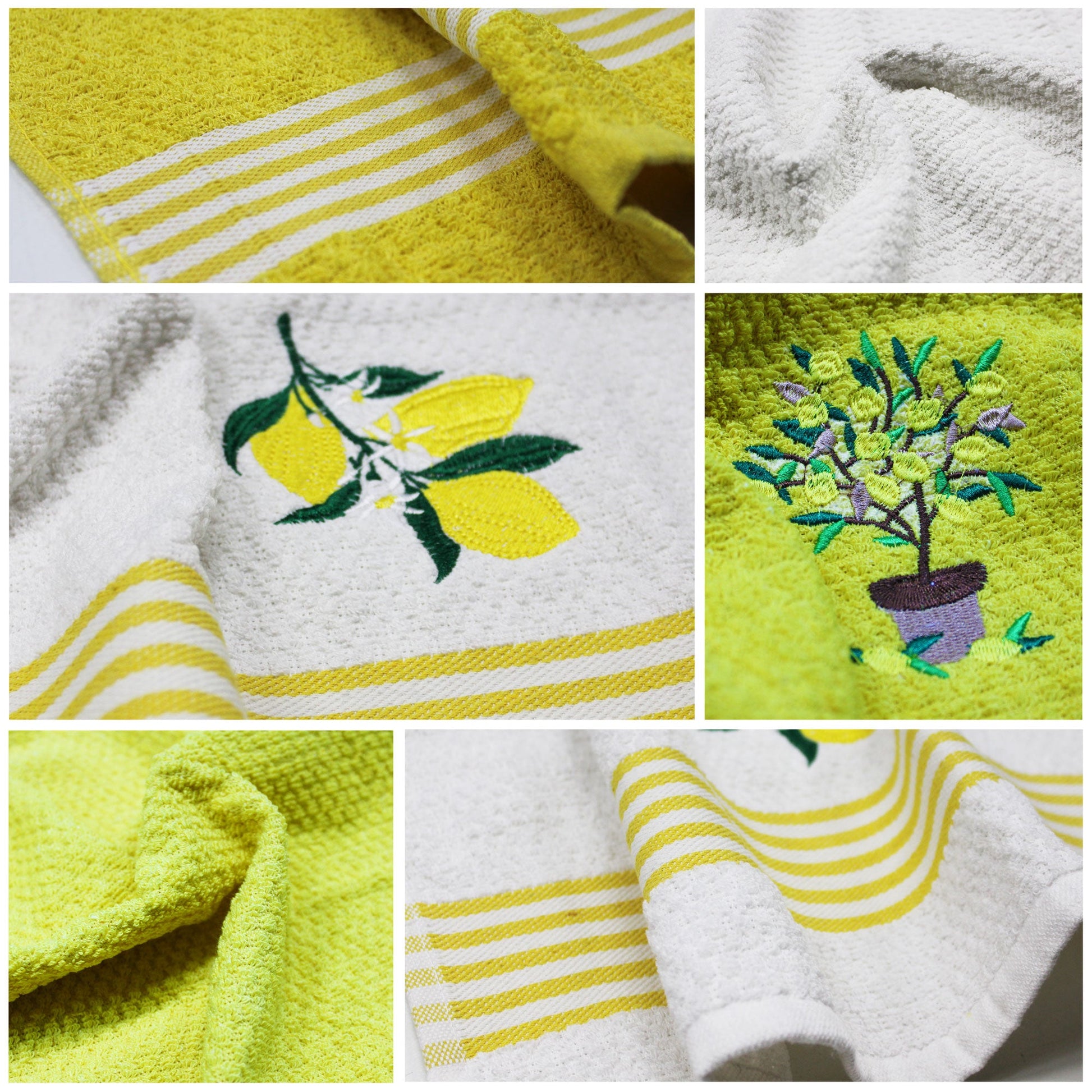 Il set comprende tre stupefacenti strofinacci, ognuno un capolavoro di stile e dettaglio. Due di essi, di un giallo fresco e righe bianche, sono impreziositi da un delicato ricamo di un alberello di limoni, simbolo di buona fortuna e prosperità. Il terzo strofinaccio, in bianco con righe gialle, presenta un affascinante ricamo di un ramo di limoni, evocando il cuore dell'arte culinaria mediterranea.