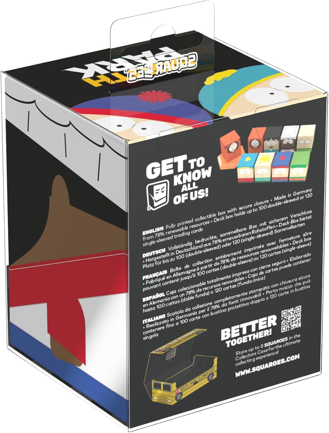Scatola da collezione per riporre mazzi di carte da gioco GCC, accessori per giochi da tavolo e/o oggetti da collezione. Il Chef Squaroe dell'edizione South Park può contenere fino a 100 carte in doppie bustine protettive se utilizzato come porta-mazzo. Gli Squaroe sono realizzati con il 78% di risorse rinnovabili e si adattano perfettamente alla Collectors Case, disponibile separatamente.