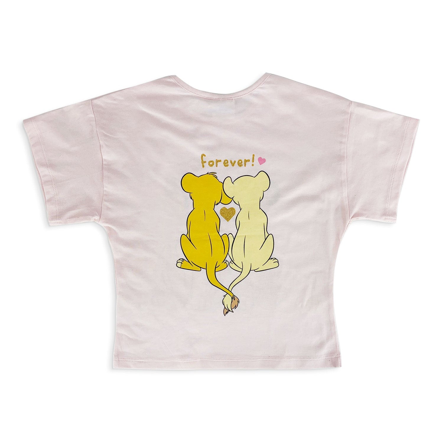 Maglia mezze maniche con stampa sia sul davanti che sul dietro di Simba e Nala con cuoricini e scritta in glitter.
