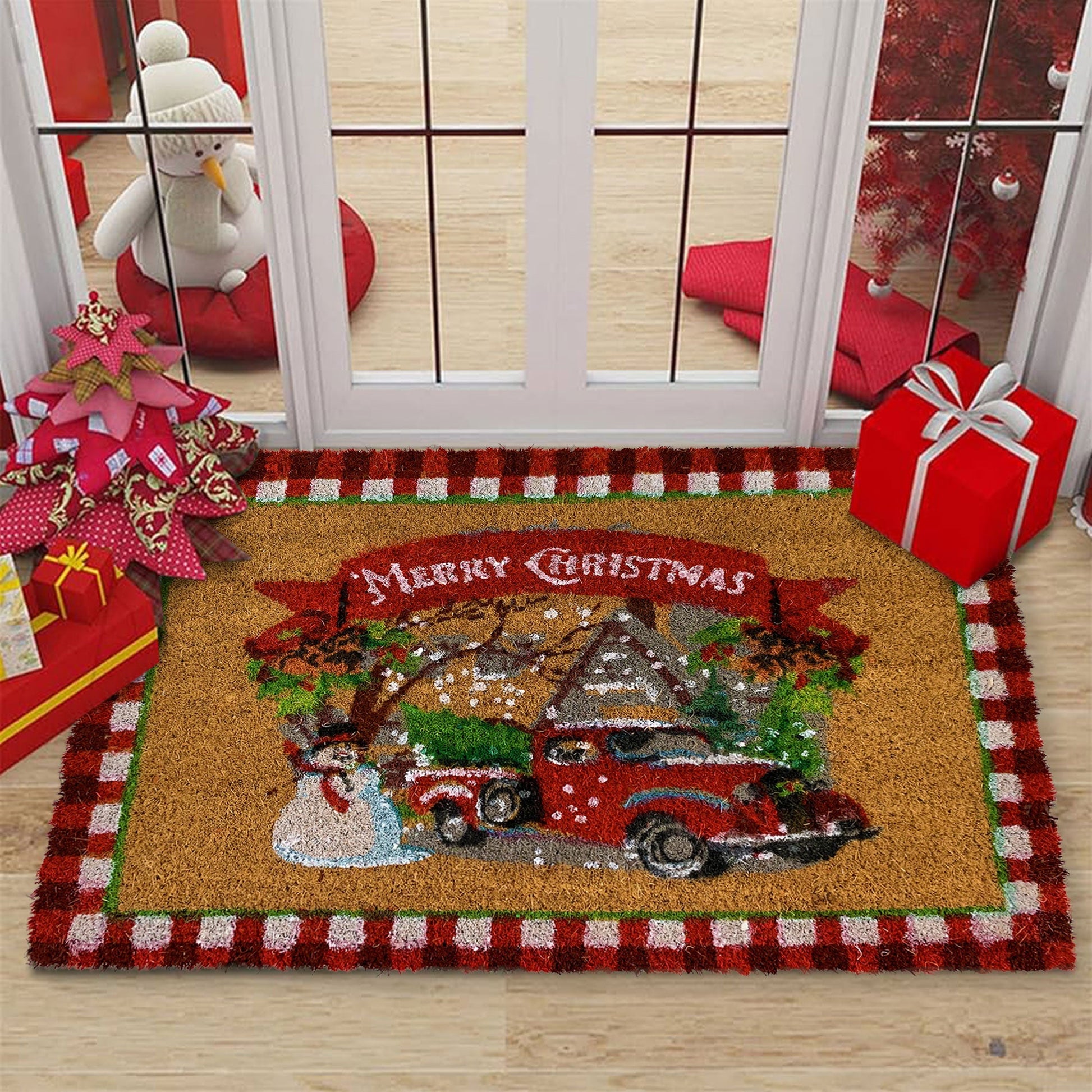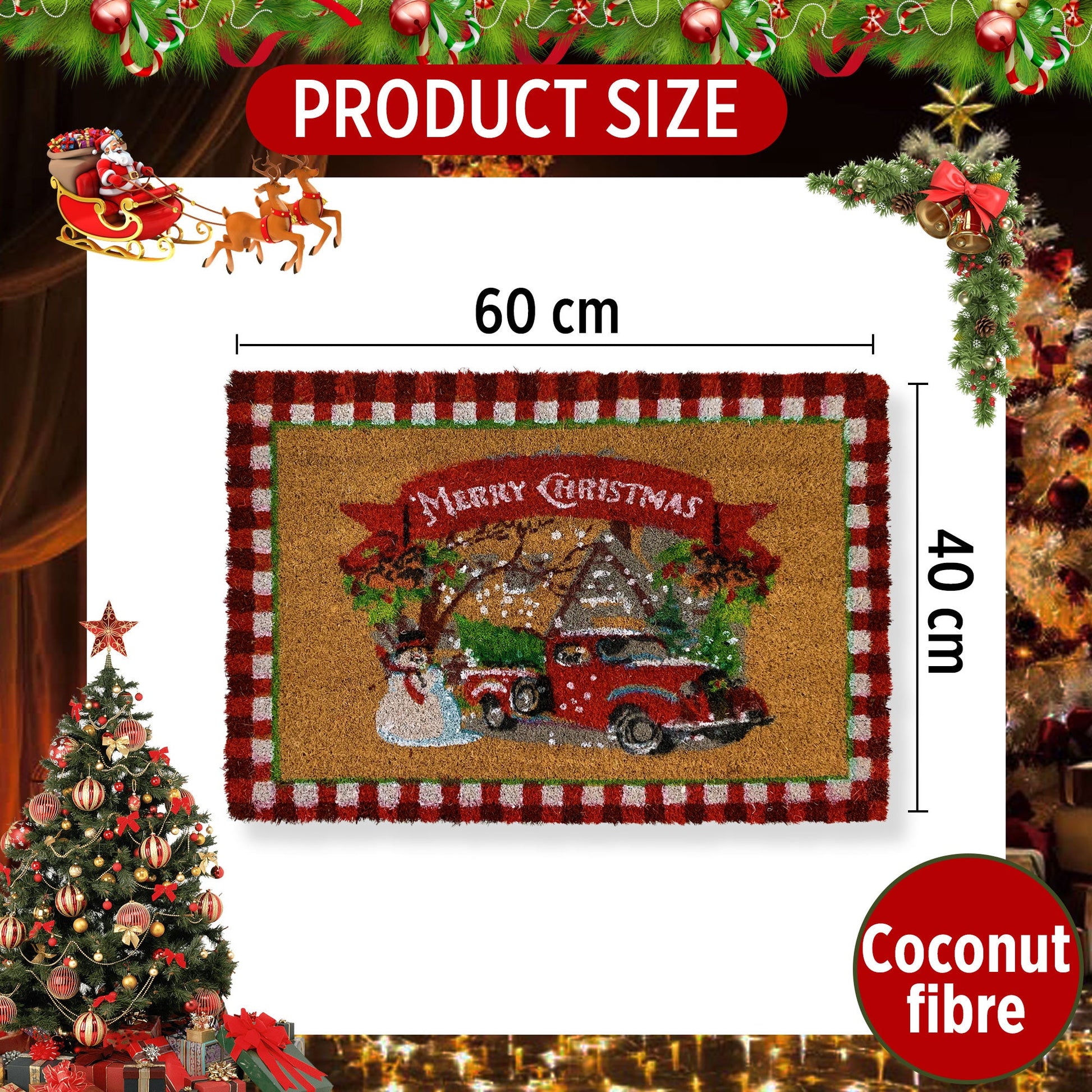 Realizzato a mano con cura, presenta una splendida stampa di un pupazzo di neve, camioncino, decori e la scritta "Merry Christmas" in alto. Questo zerbino non solo è uno splendido accessorio decorativo, ma svolge anche la sua funzione principale: pulire e asciugare le scarpe in modo efficace.