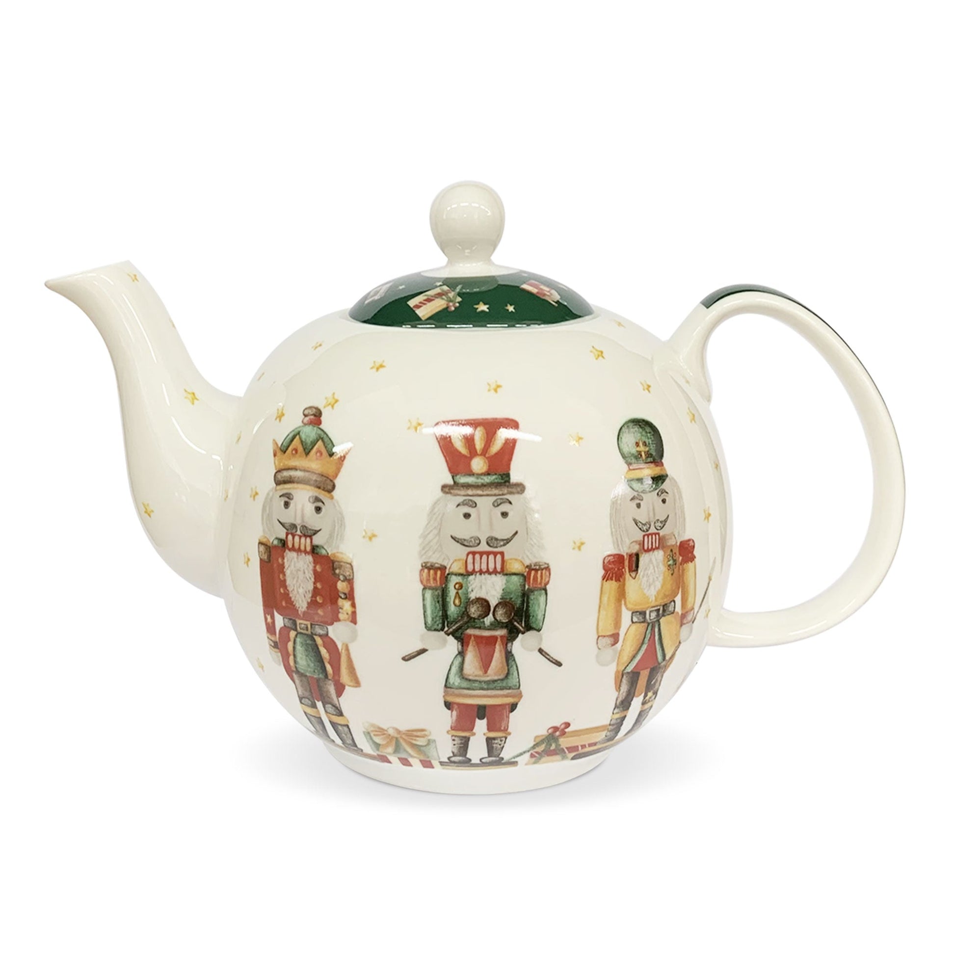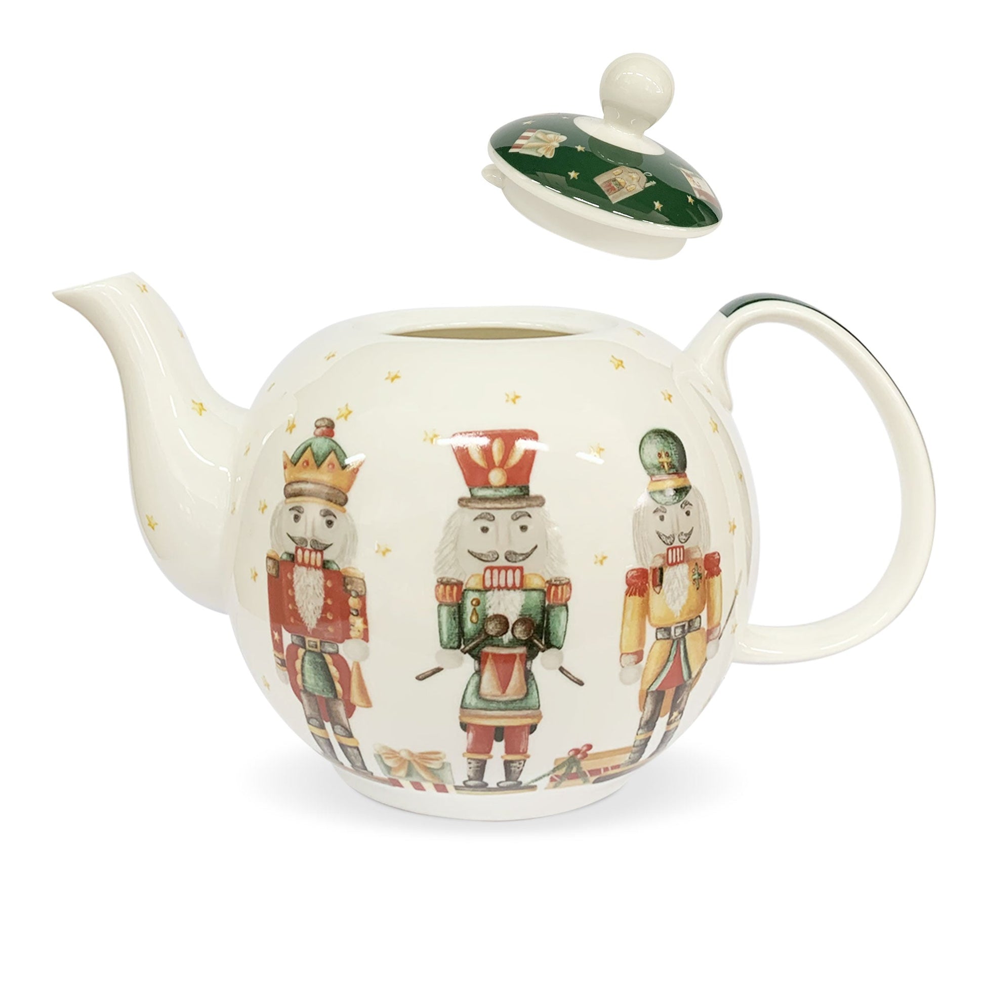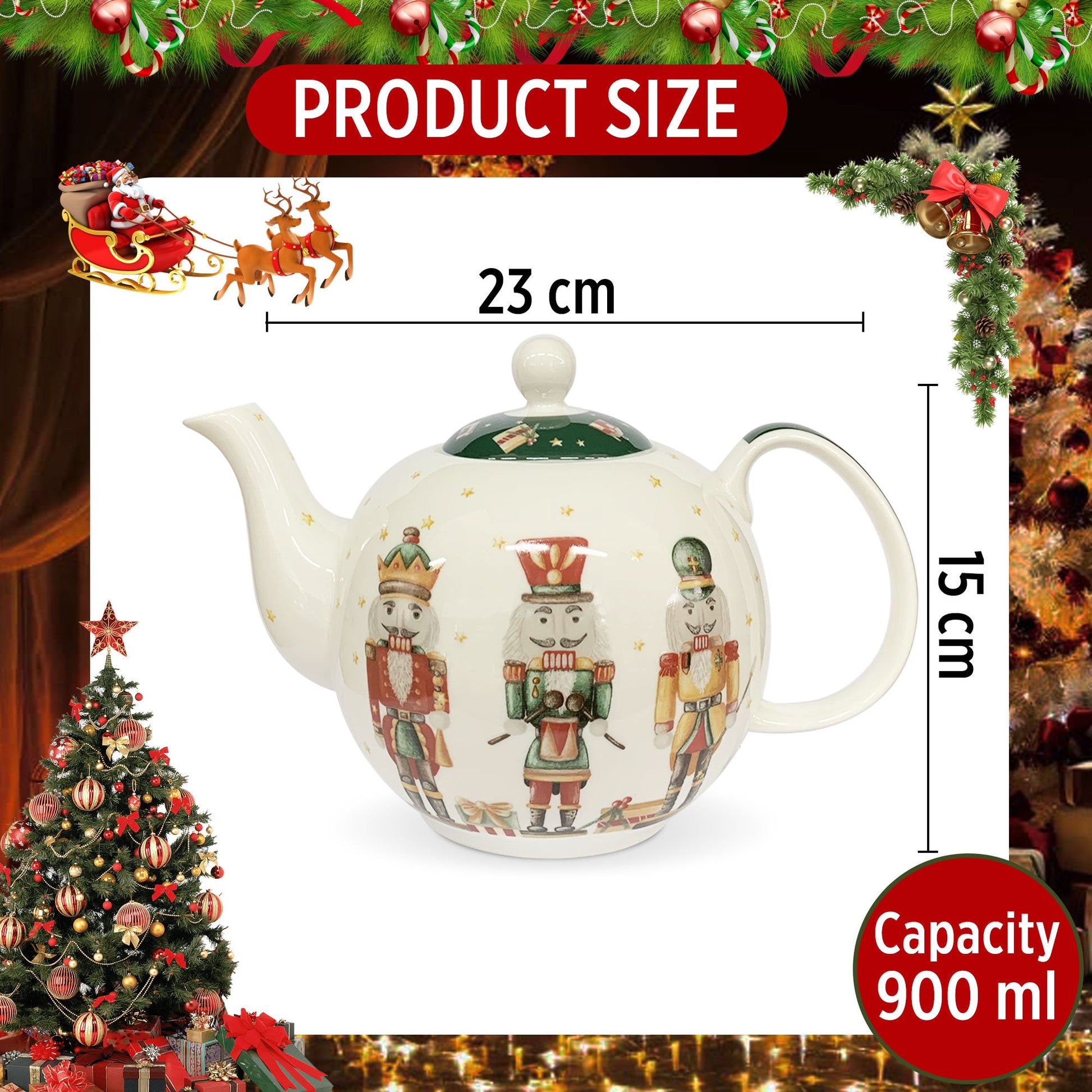 La fantasia della teiera cattura perfettamente lo spirito del Natale, con degli schiaccianoci, doni festosamente incartati e stelle dorate scintillanti. Il tappo e i manici in verde natalizio aggiungono un tocco di eleganza e tradizione.