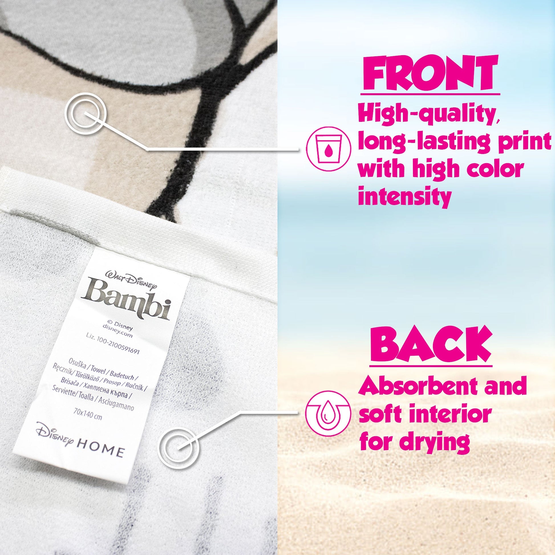 La stampa incantevole di Bambi e Tamburino su uno sfondo a pois aggiunge un tocco di natura e fantasia a ogni momento in spiaggia o in piscina. Le dimensioni di 70x140cm offrono spazio sufficiente per avvolgerti comodamente dopo un tuffo rinfrescante o distendersi al sole con stile.