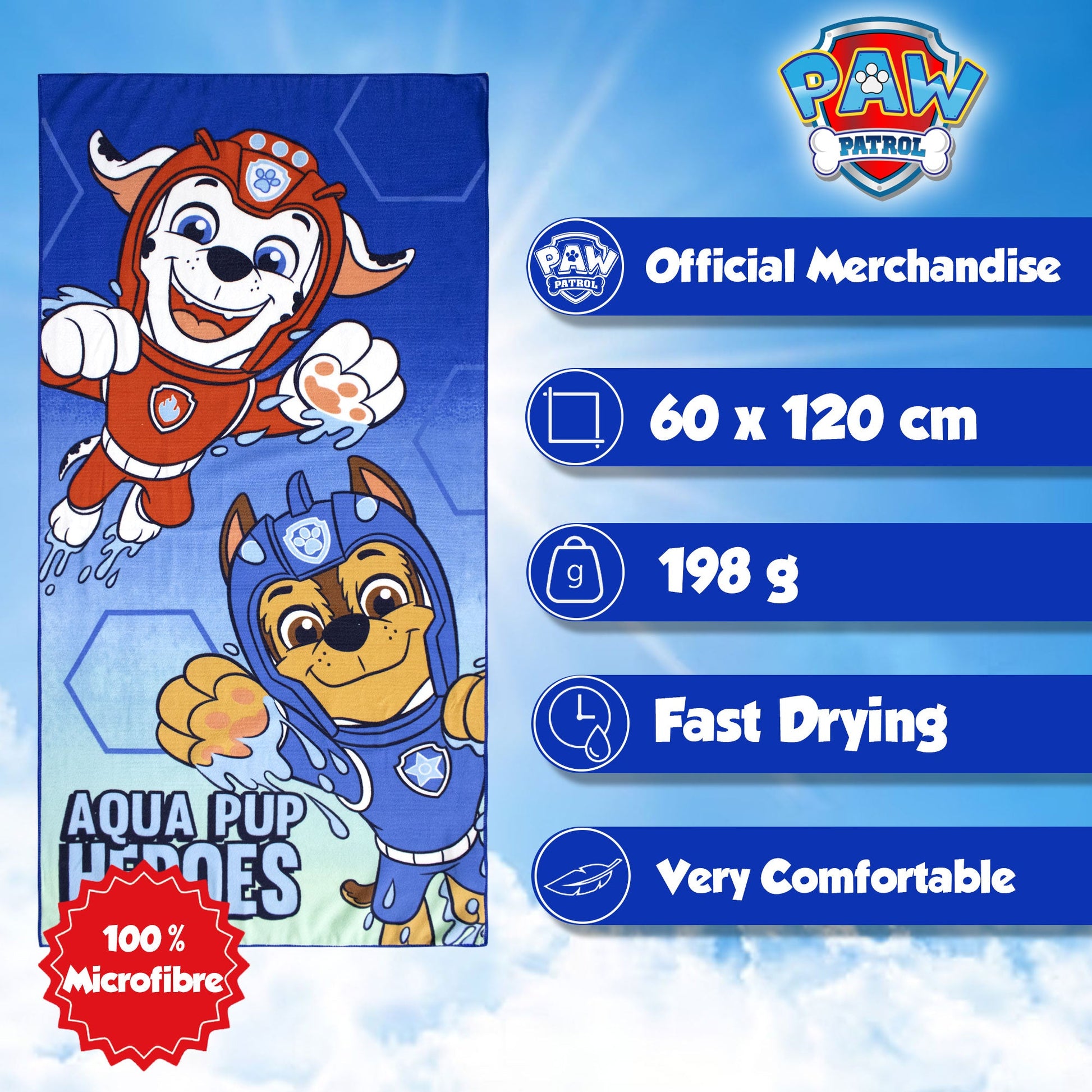 Che tu stia godendo una giornata al mare, rilassandoti in piscina o semplicemente prendendo il sole in giardino, il Telo Mare dei Paw Patrol accompagnerà il tuo bambino con stile e funzionalità. Regala ai tuoi piccoli, momenti di relax un tocco di magia e allegria con questo telo mare che unisce la praticità della microfibra alla vivacità dei Paw Patrol!