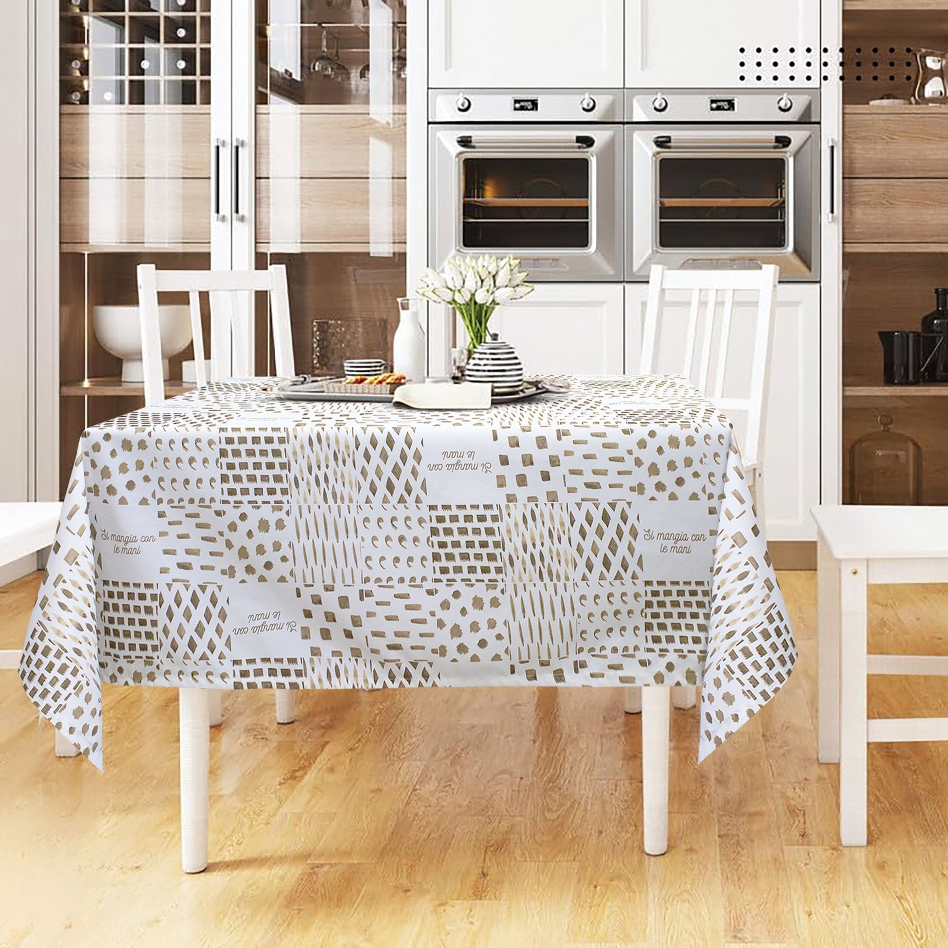 Aggiungi stile e praticità alla tua tavola con la nostra tovaglia antimacchia quadrata, l’ideale per chi cerca eleganza e praticità in ambienti come ristoranti, hotel e B&B. Il design geometrico presenta una composizione armoniosa di quadrati, rettangoli e linee diagonali, creando un effetto moderno ed elegante. Alcuni riquadri riportano la frase "Si mangia con le mani", aggiungendo un tocco di originalità e ironia al tuo ambiente.