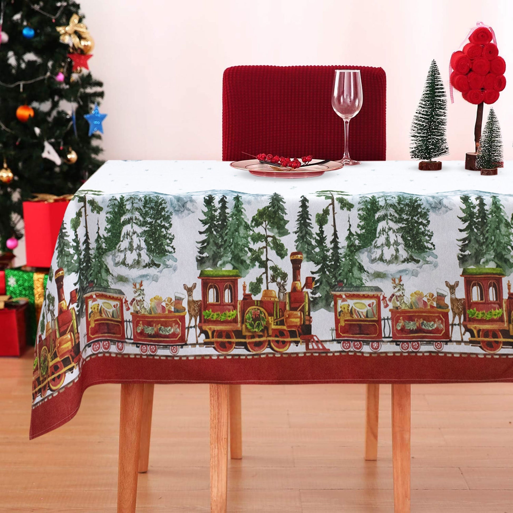 La tovaglia presenta una splendida stampa con un trenino natalizio che attraversa un paesaggio innevato, arricchito da dettagli invernali e festivi che trasportano te e i tuoi ospiti direttamente nel cuore della magia natalizia.