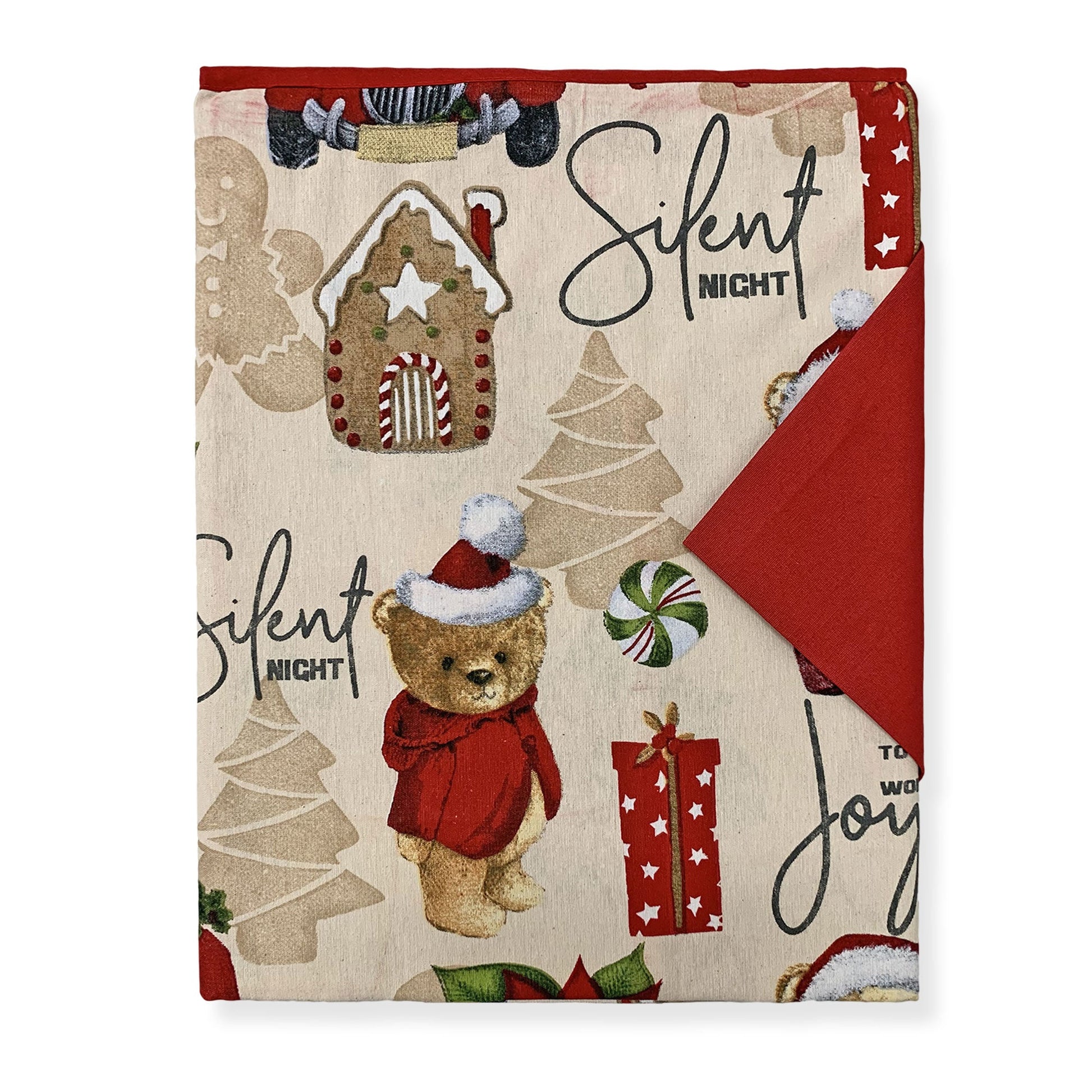 La tovaglia da 140x235cm è realizzata in resistente cotone loneta, con una trama di 180gr/mq che la rende perfetta per l'uso quotidiano. La stampa con motivi natalizi aggiunge un tocco di festa all'ambiente, mentre il bordo rifinito con sbieco in tinta unita completa il look con stile.