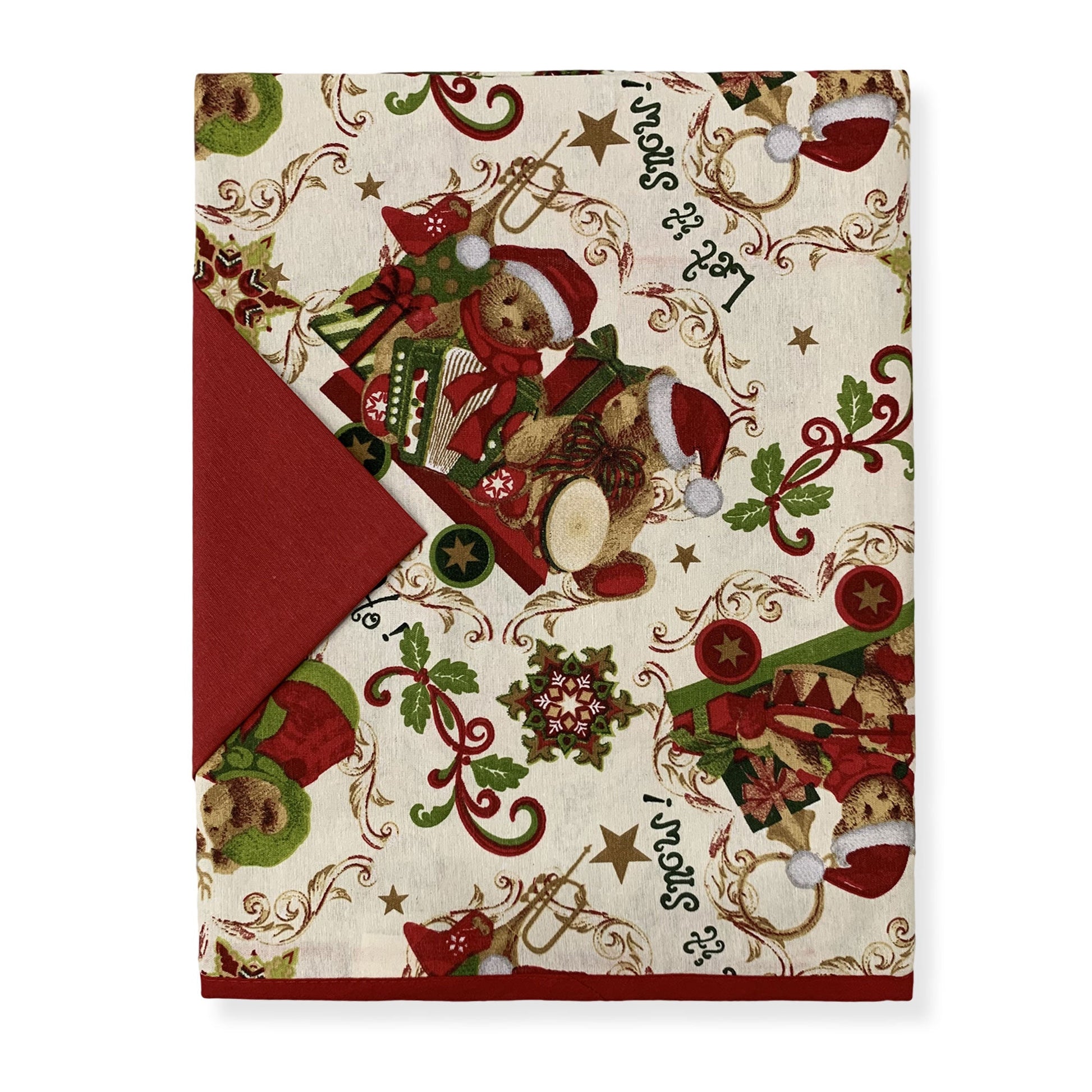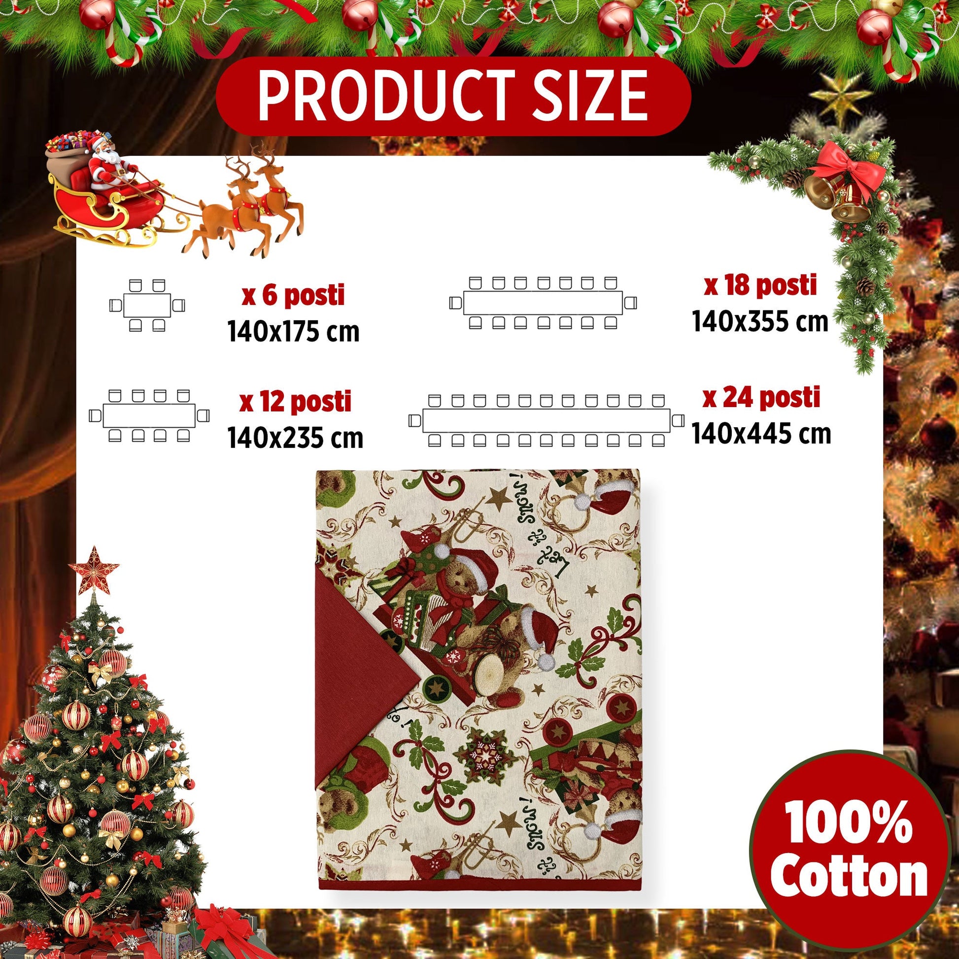 La tovaglia da 140x355cm è realizzata in resistente cotone loneta, con una trama di 180gr/mq che la rende perfetta per l'uso quotidiano. La stampa con motivi natalizi aggiunge un tocco di festa all'ambiente, mentre il bordo rifinito con sbieco in tinta unita completa il look con stile.