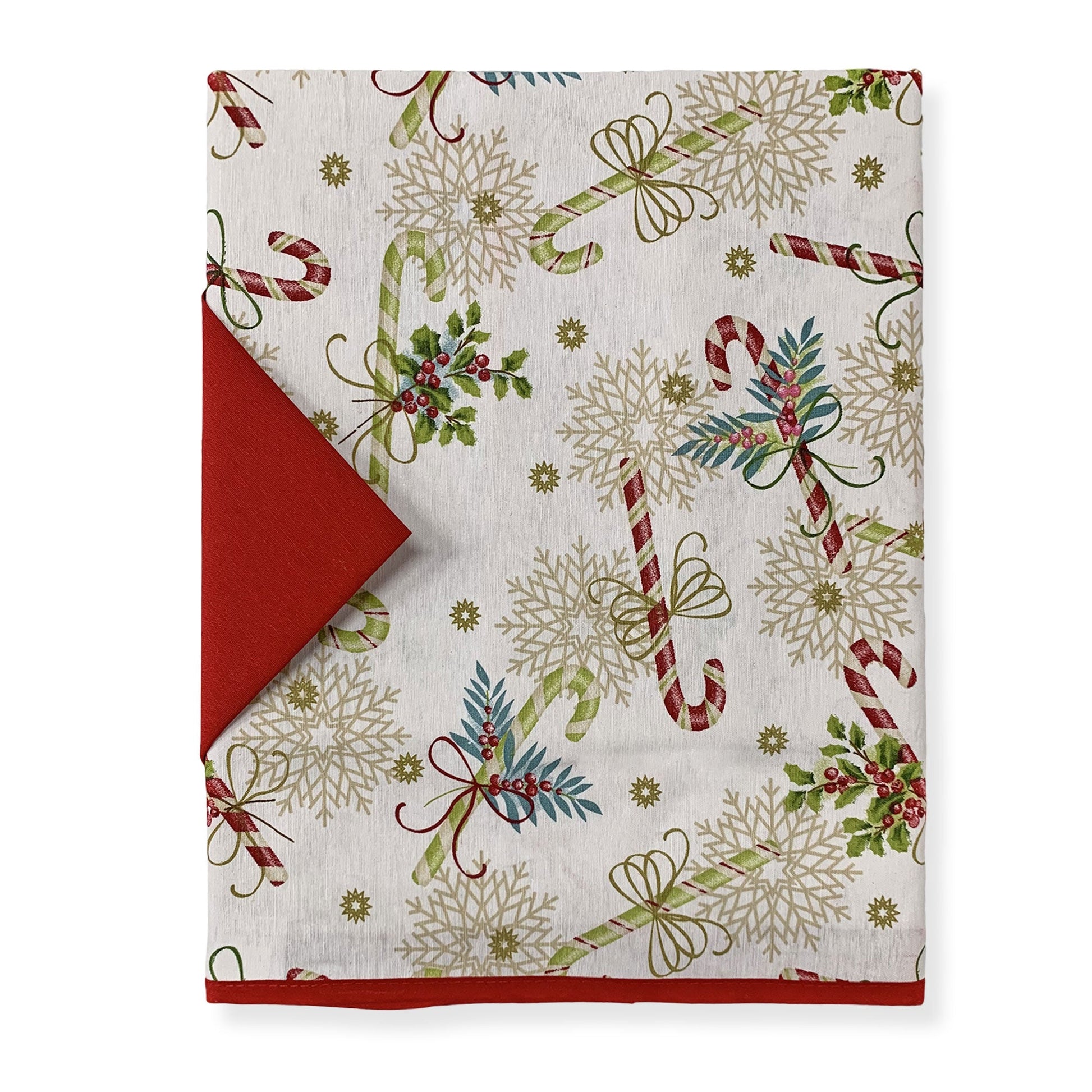 La tovaglia da 140x445cm è realizzata in resistente cotone loneta, con una trama di 180gr/mq che la rende perfetta per l'uso quotidiano. La stampa con motivi natalizi aggiunge un tocco di festa all'ambiente, mentre il bordo rifinito con sbieco in tinta unita completa il look con stile.