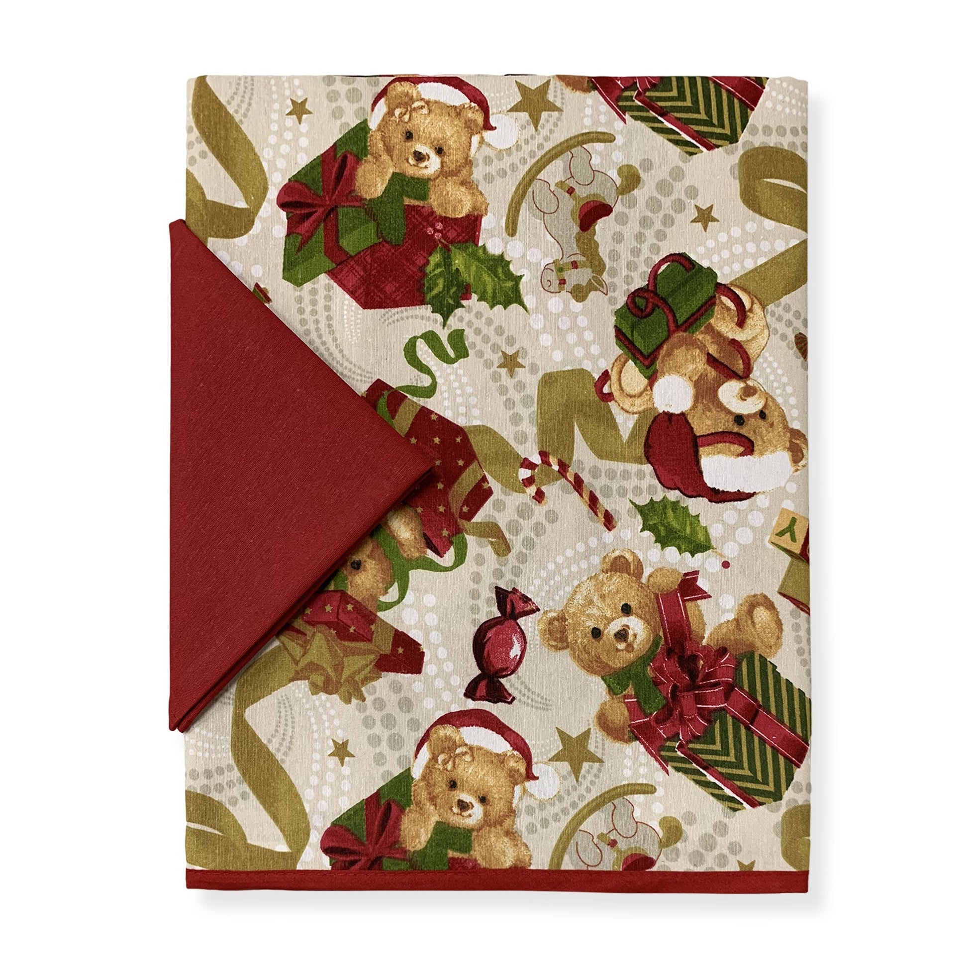 La tovaglia da 140x445cm è realizzata in resistente cotone loneta, con una trama di 180gr/mq che la rende perfetta per l'uso quotidiano. La stampa con motivi natalizi aggiunge un tocco di festa all'ambiente, mentre il bordo rifinito con sbieco in tinta unita completa il look con stile.