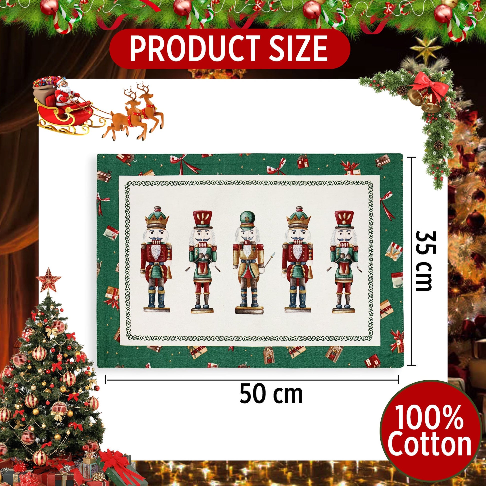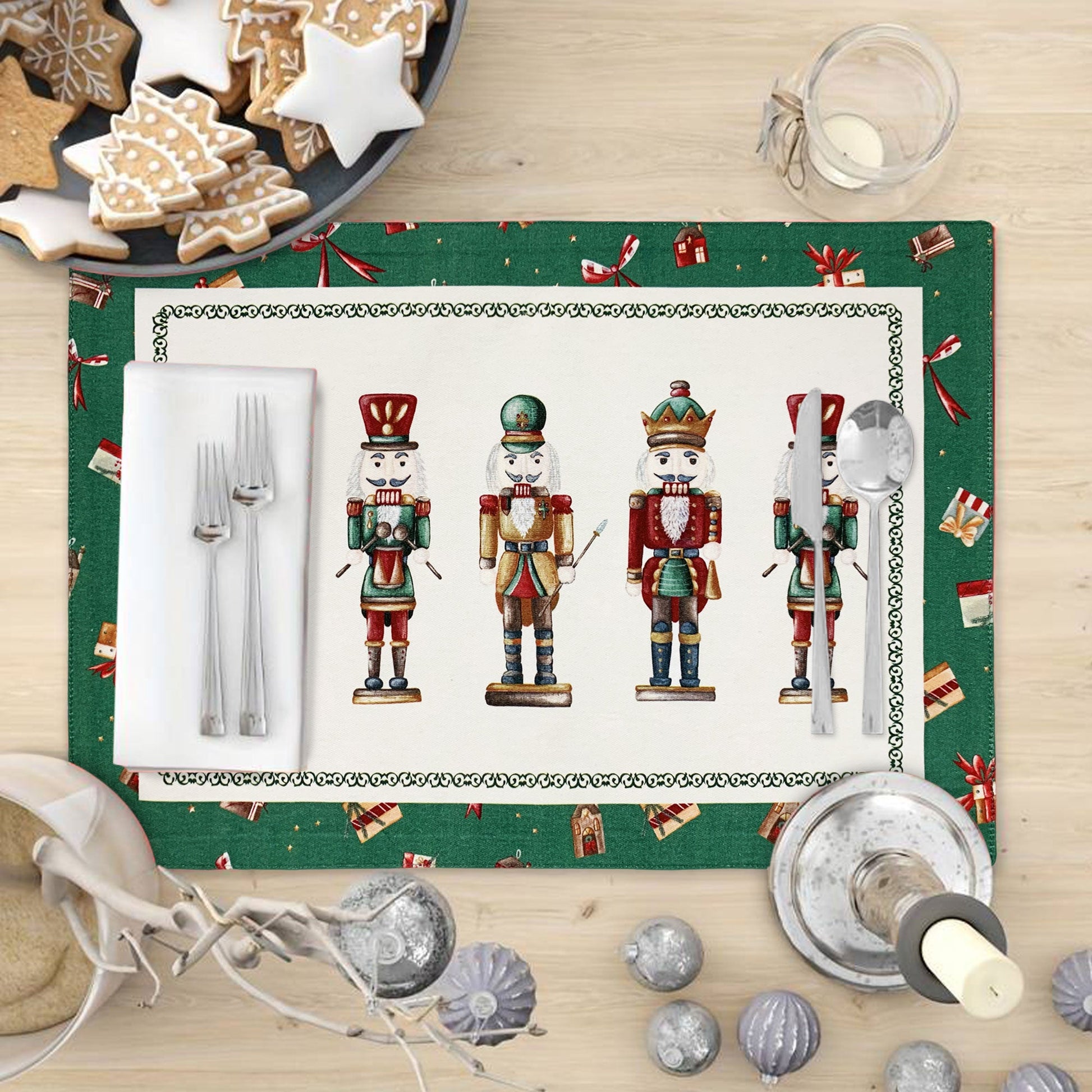Il lato anteriore presenta un bordo verde decorato con pacchetti regalo incartati con cura e al centro cinque Schiaccianoci, ognuno con la sua personalità unica. Questa disposizione incantevole aggiunge un tocco di tradizione natalizia alla tua tavola.