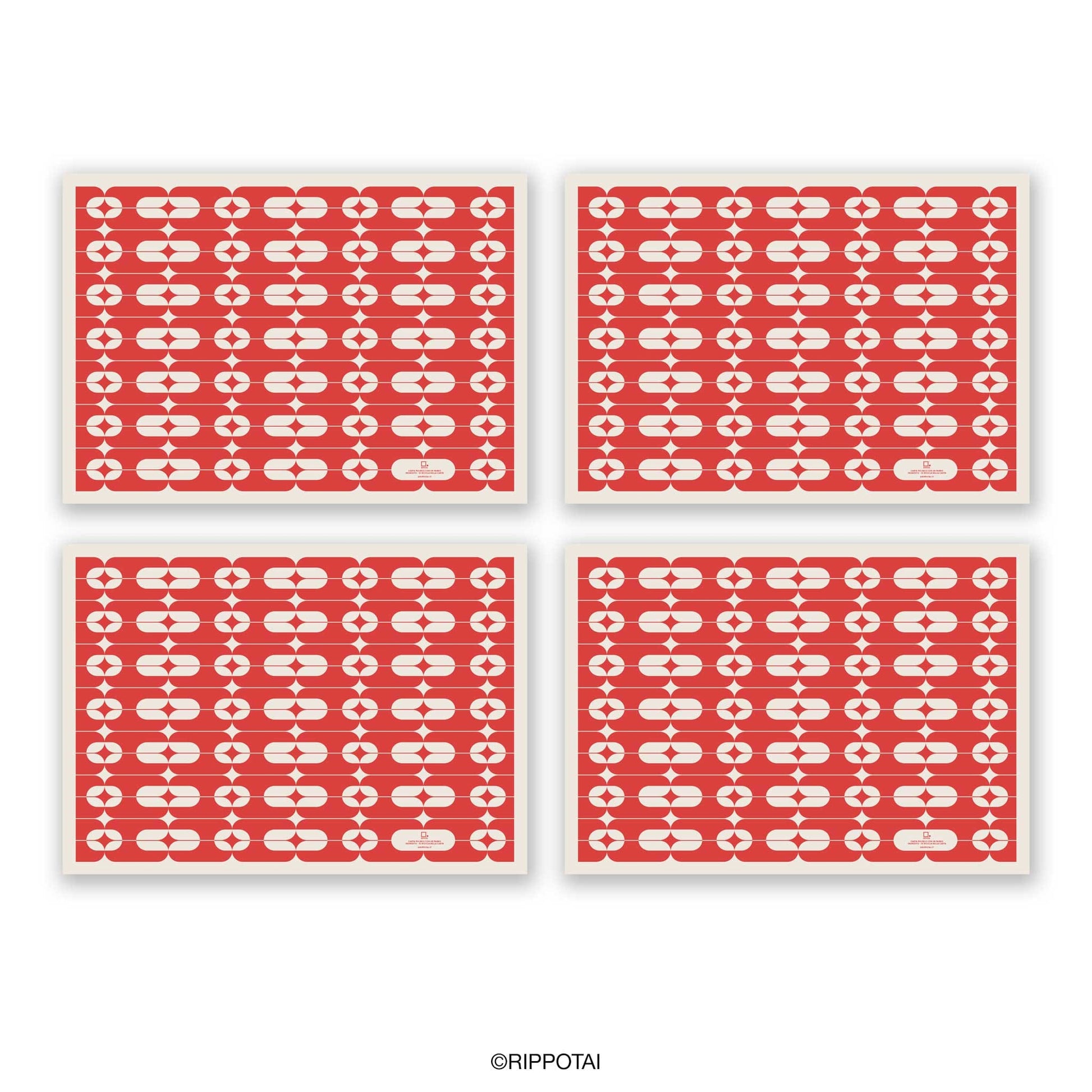 Il set da 4 tovagliette presenta un raffinato motivo geometrico rosso e avorio, ispirato ai decori vintage anni ’60 reinterpretati in chiave moderna: una scelta di design ideale per chi ama la tradizione con un tocco contemporaneo.