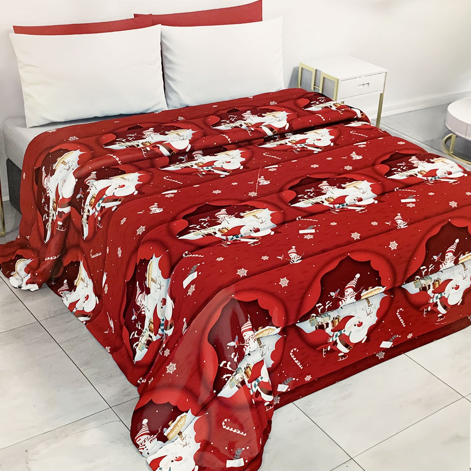 Porta la magia del Natale nella tua camera da letto con la Trapunta Natalizia Christmas, disponibile in tre misure: 170x260 cm (1 piazza), 220x260 cm (1 piazza e mezza) e 260x260 cm (matrimoniale). Perfetta per avvolgerti in un caldo abbraccio durante le notti più fredde.