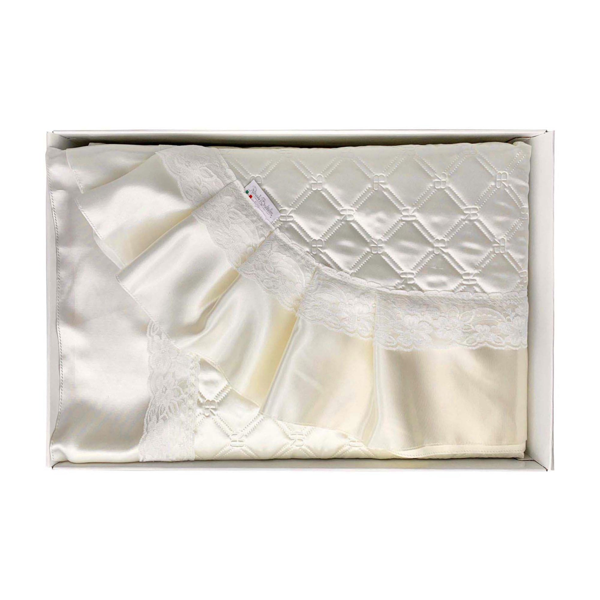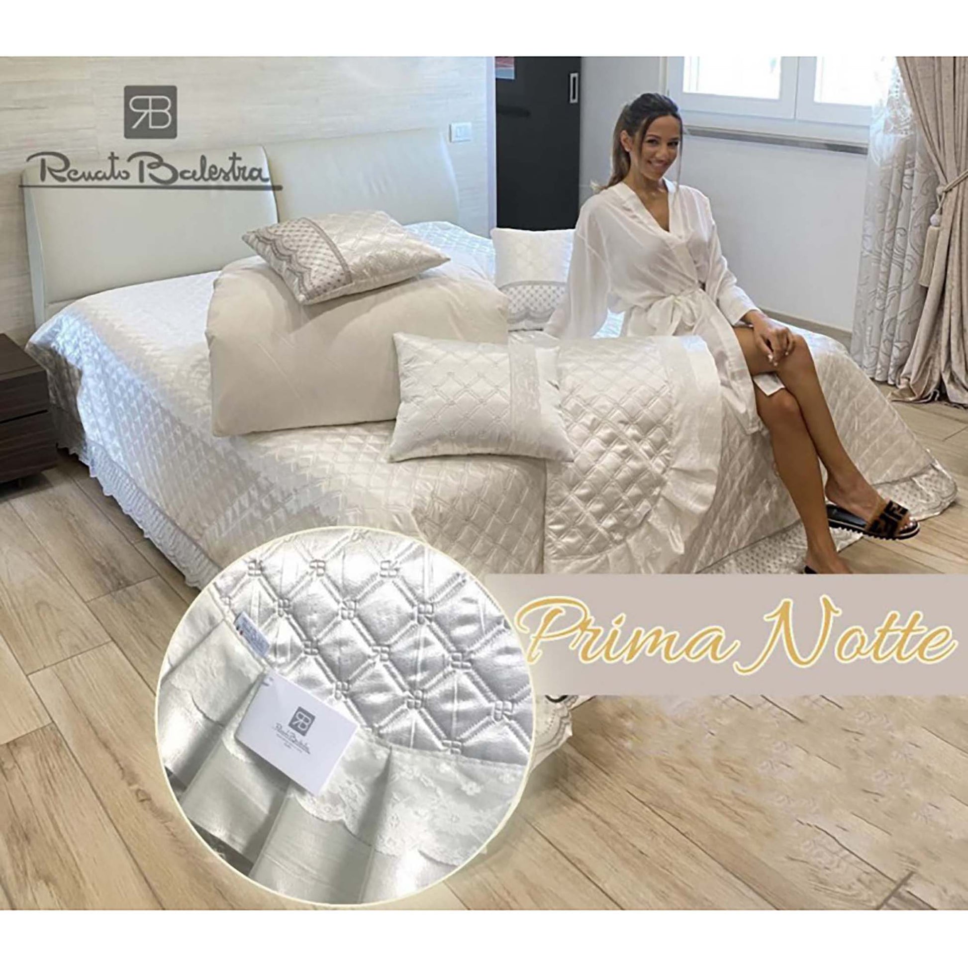 Il trapuntino Prima Notte con il suo tessuto in raso di poliestere e passamaneria in merletto, rende un effetto luminoso adatto ad ogni tipo di ambiente.