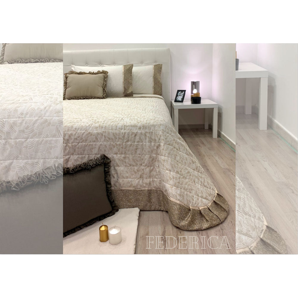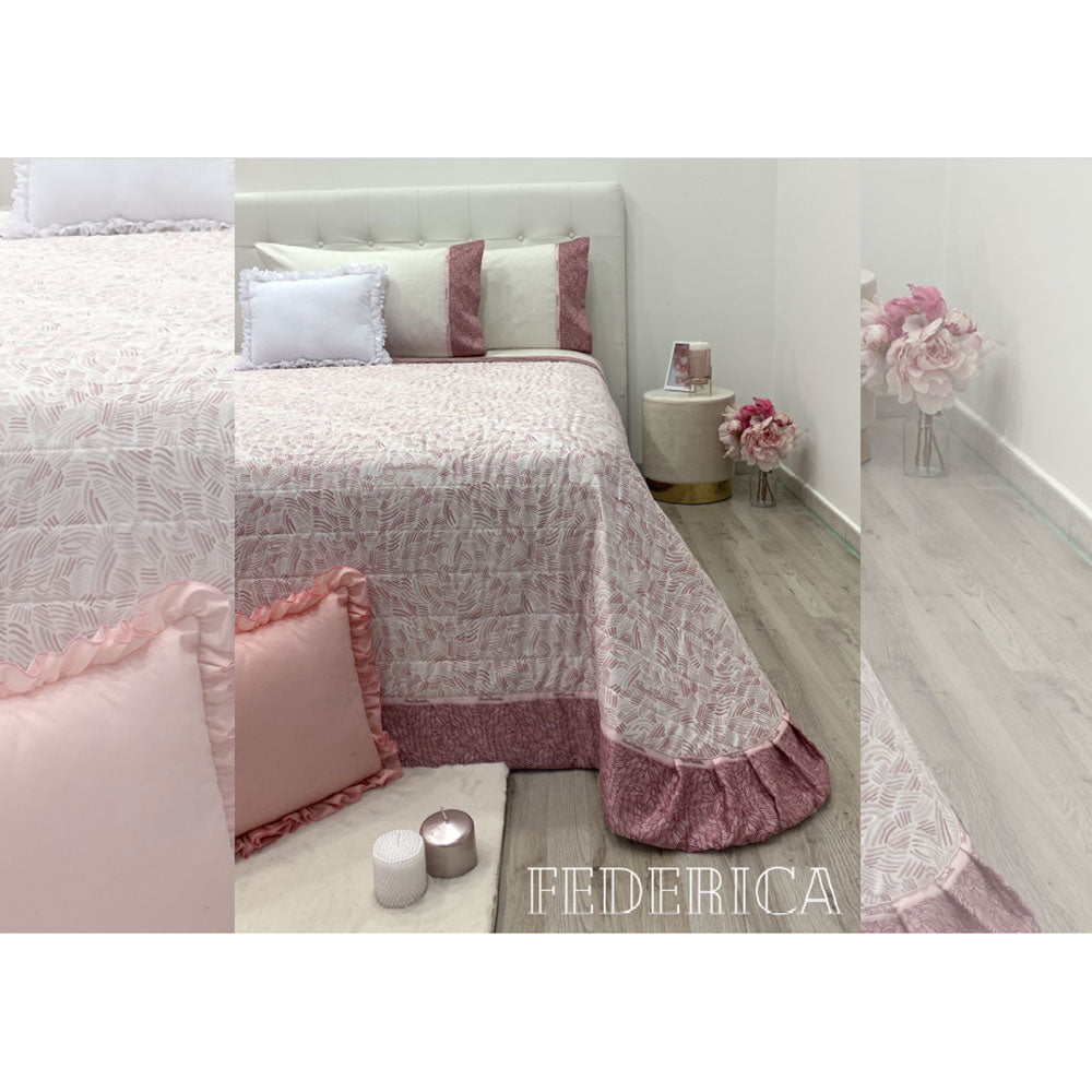Il copriletto trapuntato art. Federica con il suo tessuto in policotone stampato e balza doppio tono rifinita con nastro firmato Renato Balestra crea un effetto fine e ricercato alla camera da letto e si adatta ad ogni tipo di ambiente.