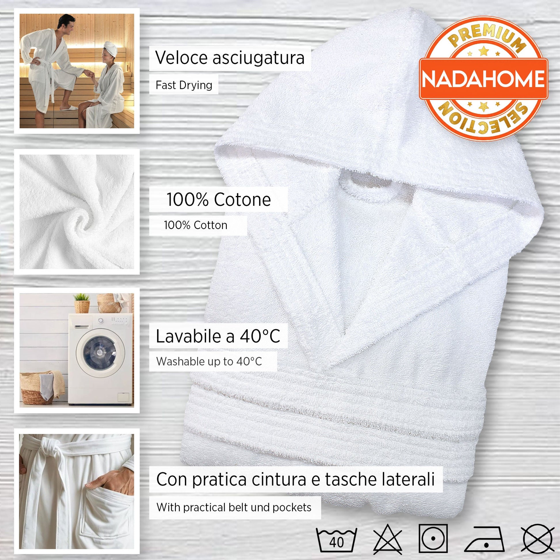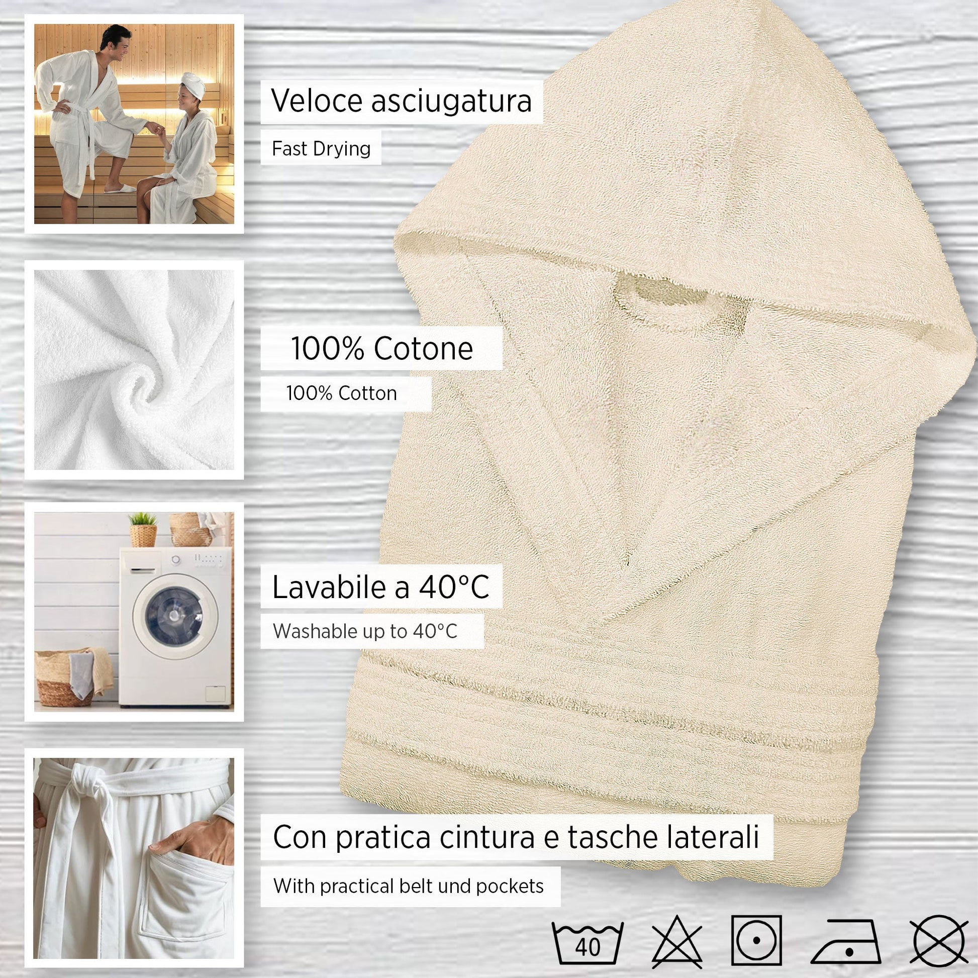 Il design unisex con cappuccio avvolgente garantisce massima praticità e calore dopo ogni doccia o bagno. Le due comode tasche ti permettono di tenere a portata di mano l’essenziale, mentre la cintura in vita assicura una vestibilità perfetta.