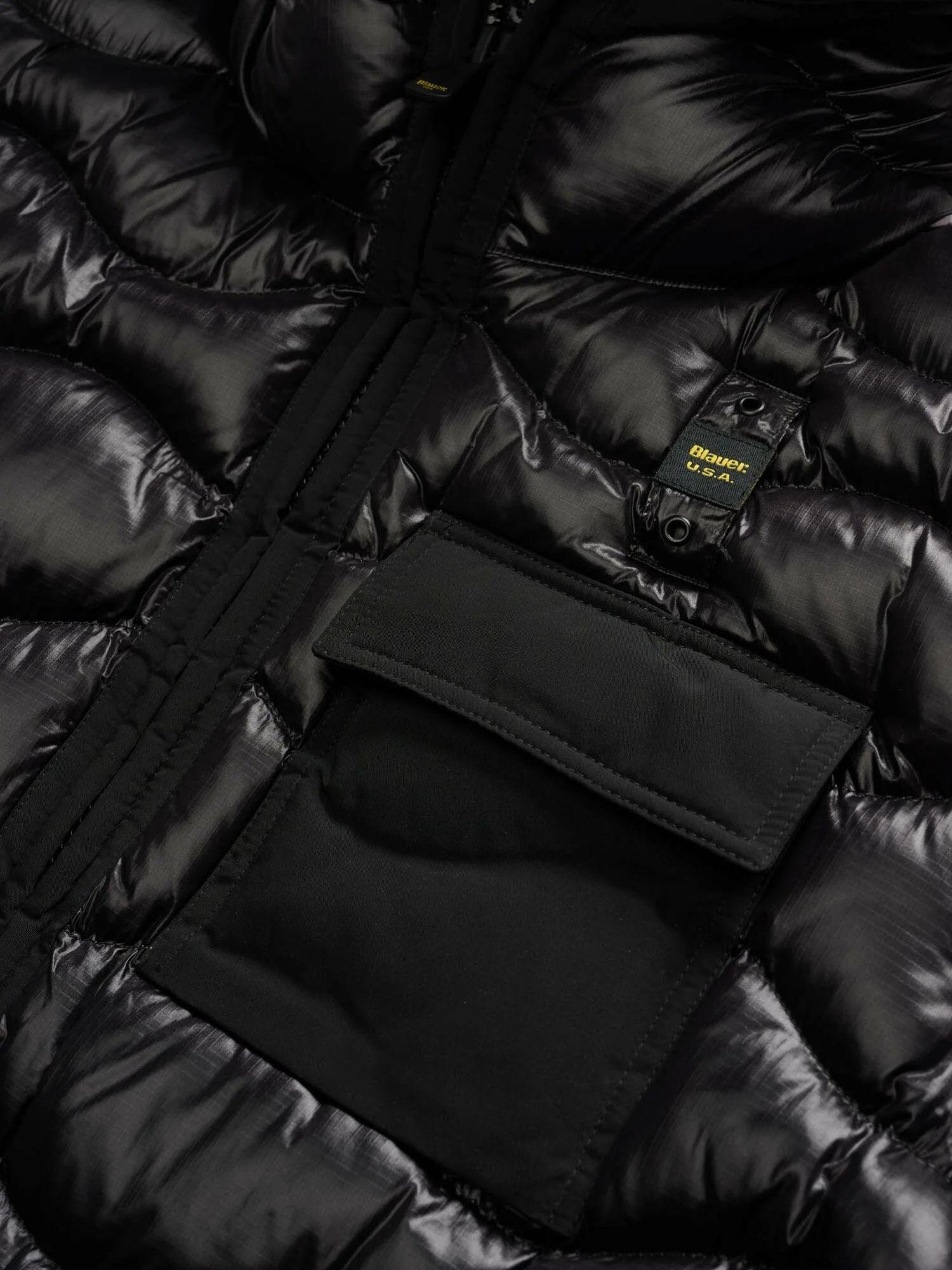 Giubbetto Blauer da uomo idrorepellente realizzato in nylon micro-rip con leggero motivo check e inserti in taslan tono su tono sul profilo del cappuccio, delle zip e nel taschino sul petto. Il cappuccio fisso con coulisse e la fodera in contrasto colore aggiungono funzionalità e carattere. Imbottito con ovatta Sorona® Aura sostenibile, offre calore, comfort e mantiene la forma nel tempo. Dotato di chiusura con zip nascosta, tasche frontali con zip invisibile, tasca sul petto con velcro e coulisse regolabile sul fondo per una vestibilità personalizzata. Allinterno presenta ampie tasche aperte e piccole tasche con chiusura in velcro. Rifinito con patch e passante con logo Blauer, simboli di qualità e stile autentico.