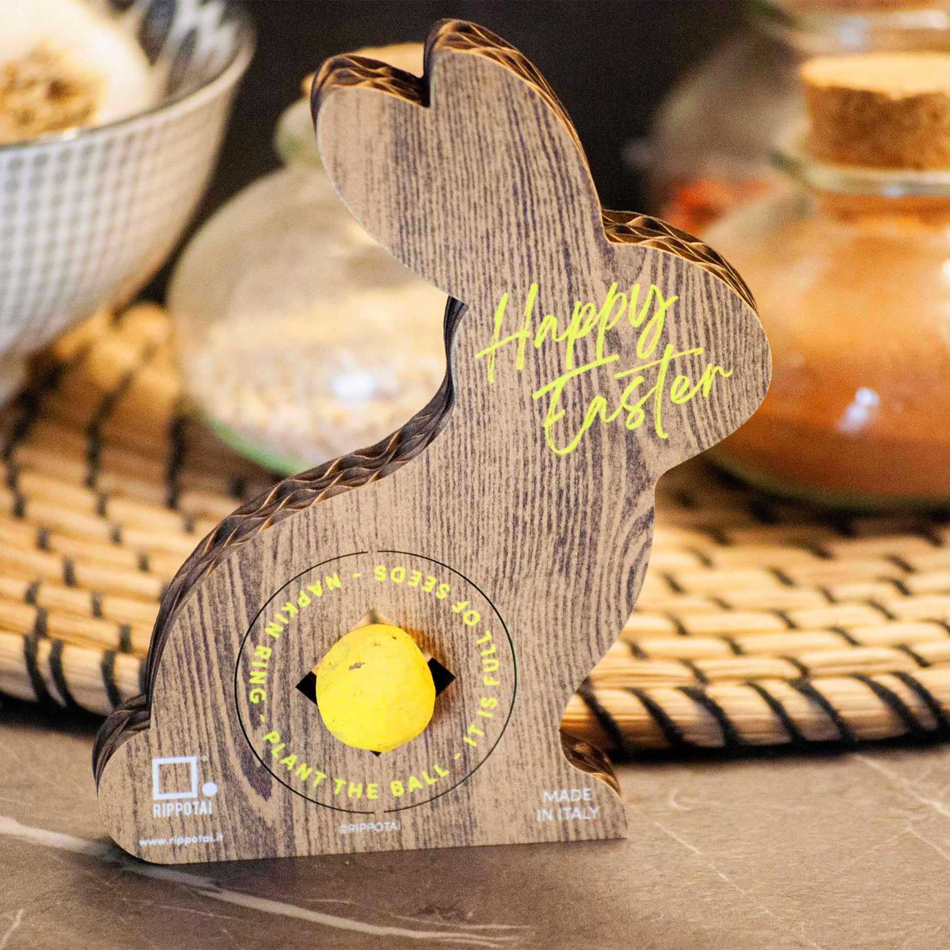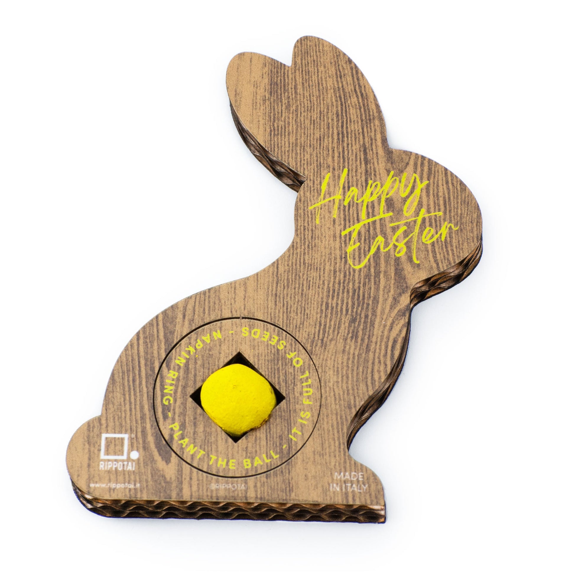 Il coniglietto pasquale ecologico può arredare la tua tavola ed allo stesso tempo riempire di fiori i tuoi vasi e il tuo giardino. Un'idea regalo sostenibile per dare il benvenuto alla Primavera ed alla bella stagione. Il coniglietto è realizzato in cartone ecologico resistente e contiene una bomba di semi: un cuore di argilla con tanti piccoli semi di fiori di campo pronti a sbocciare.