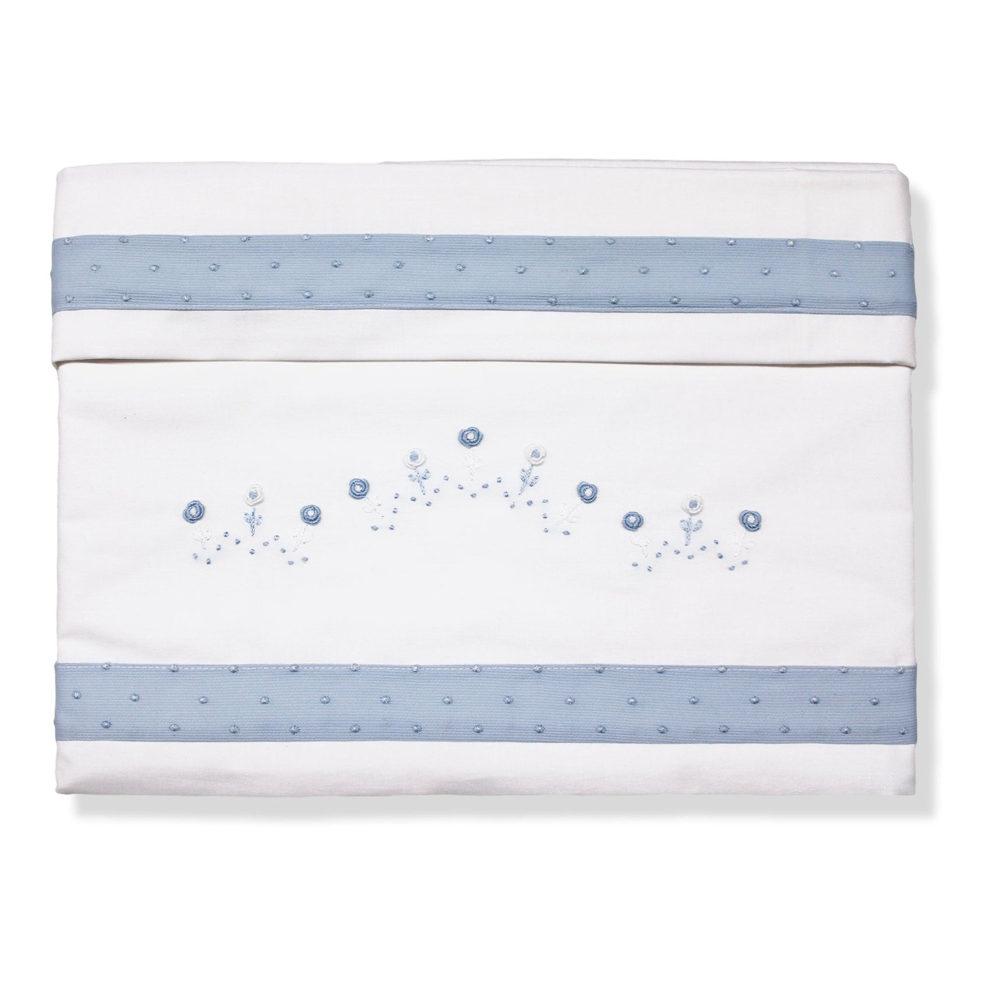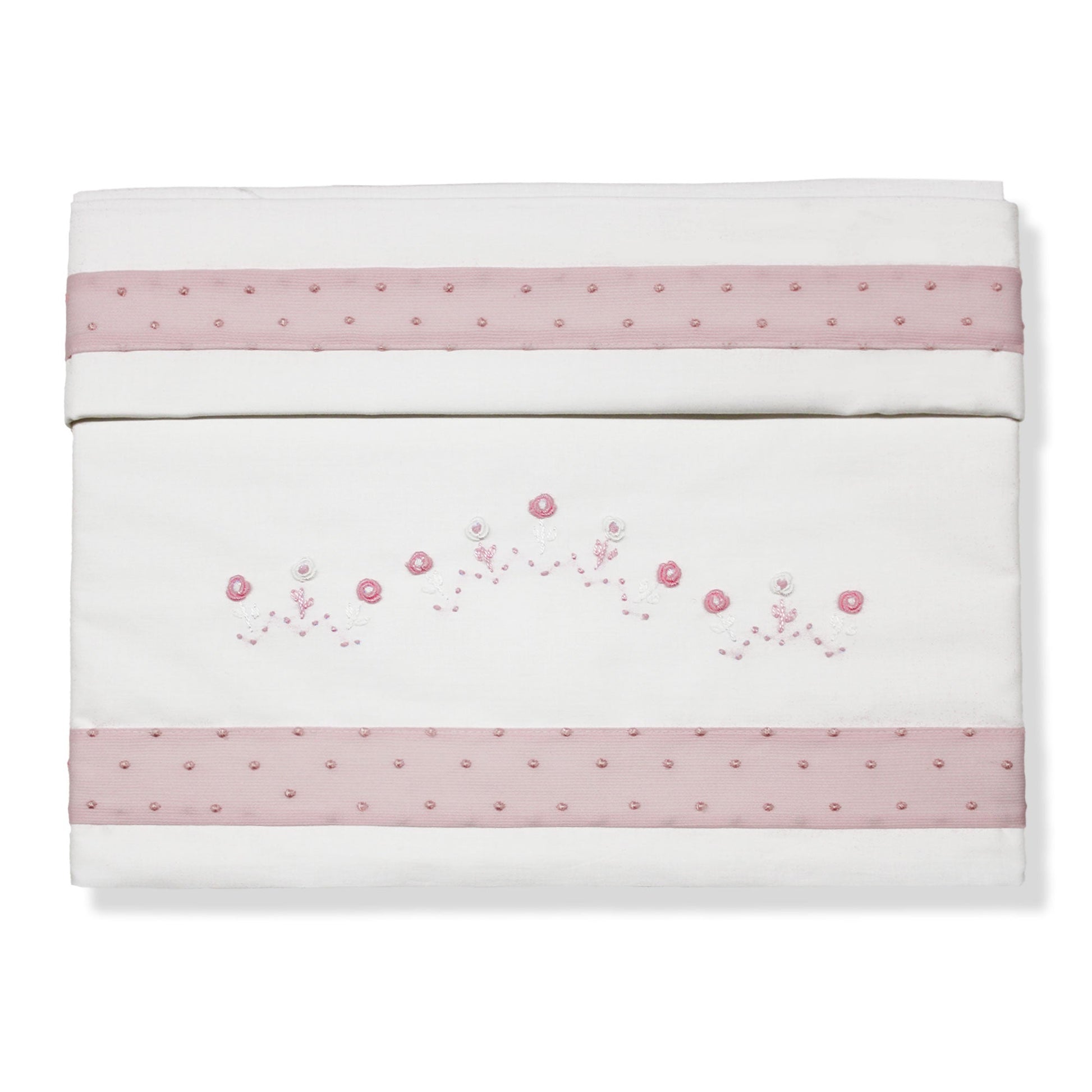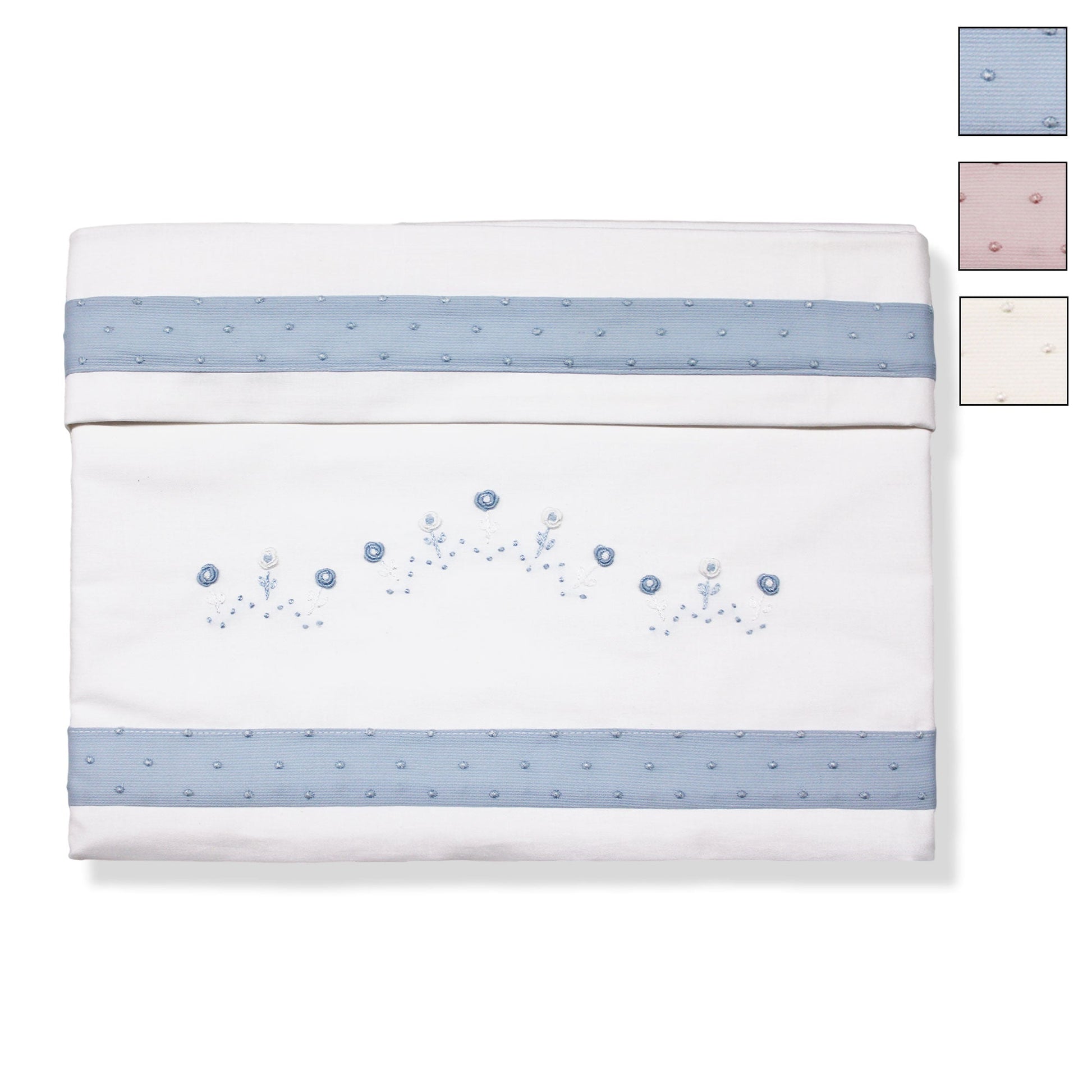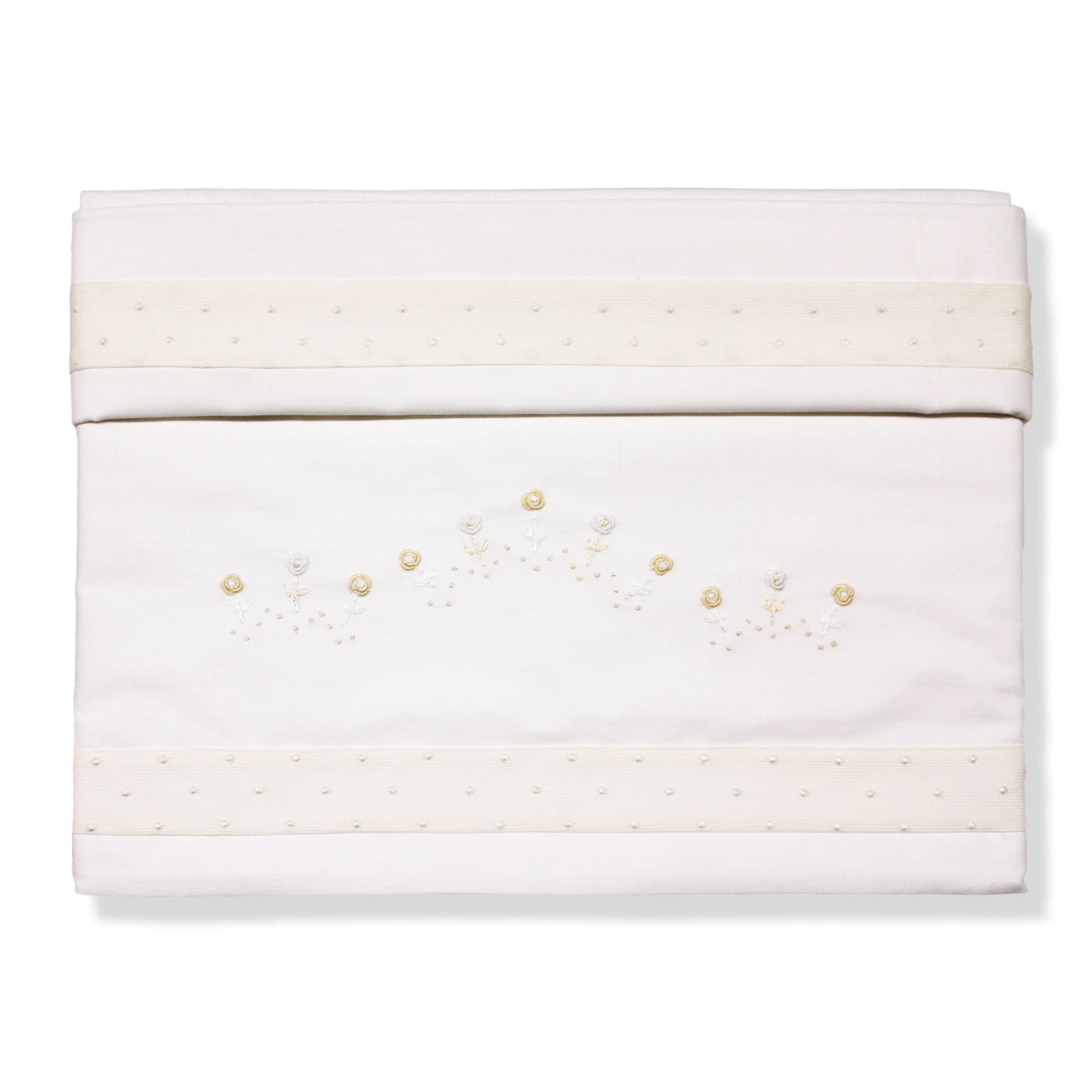 L'eccellenza del coordinato prodotto in Italia si manifesta nei dettagli: le delicate roselline cucite a mano conferiscono un tocco di grazia e raffinatezza unica, donando alla culla del tuo bambino un'eleganza senza tempo.