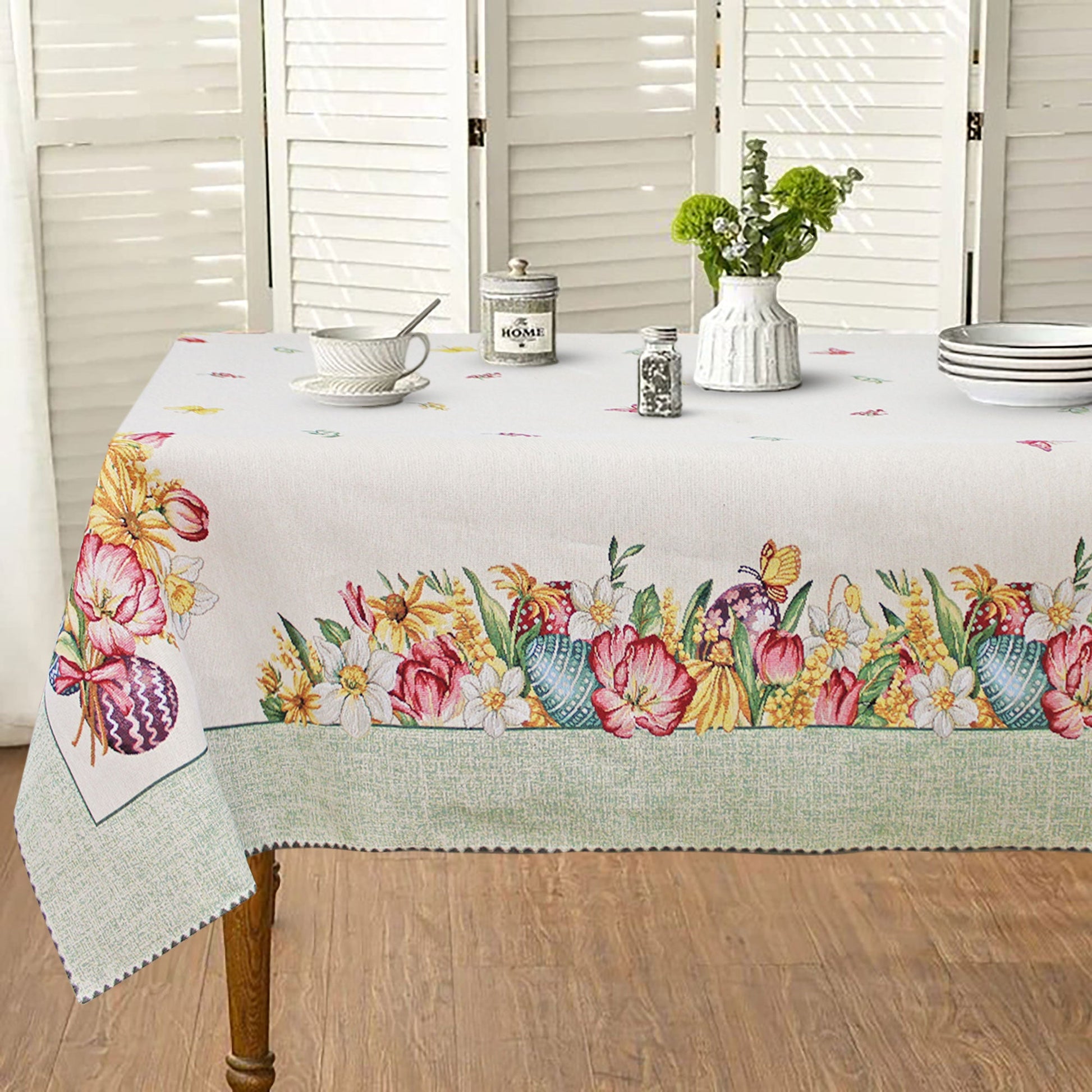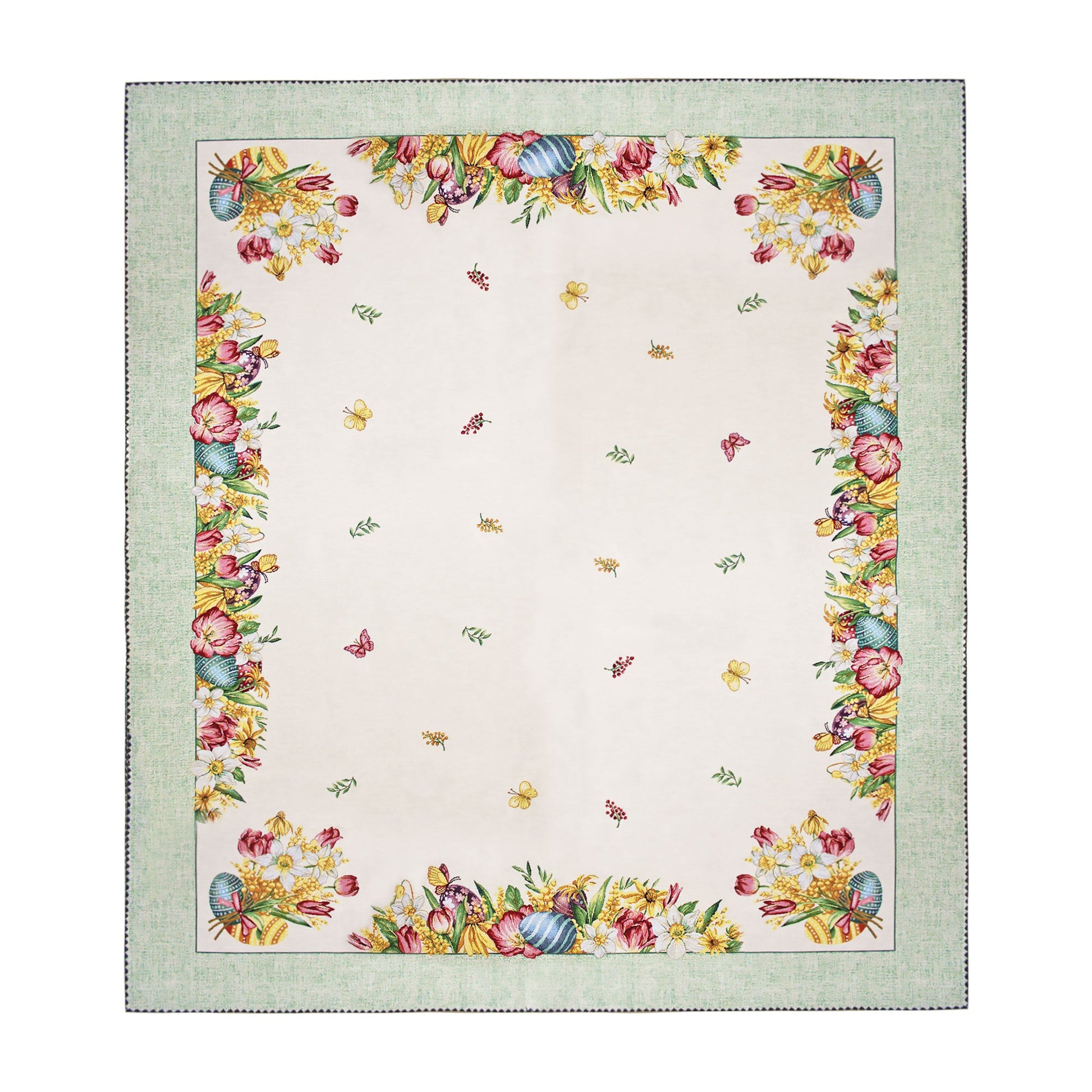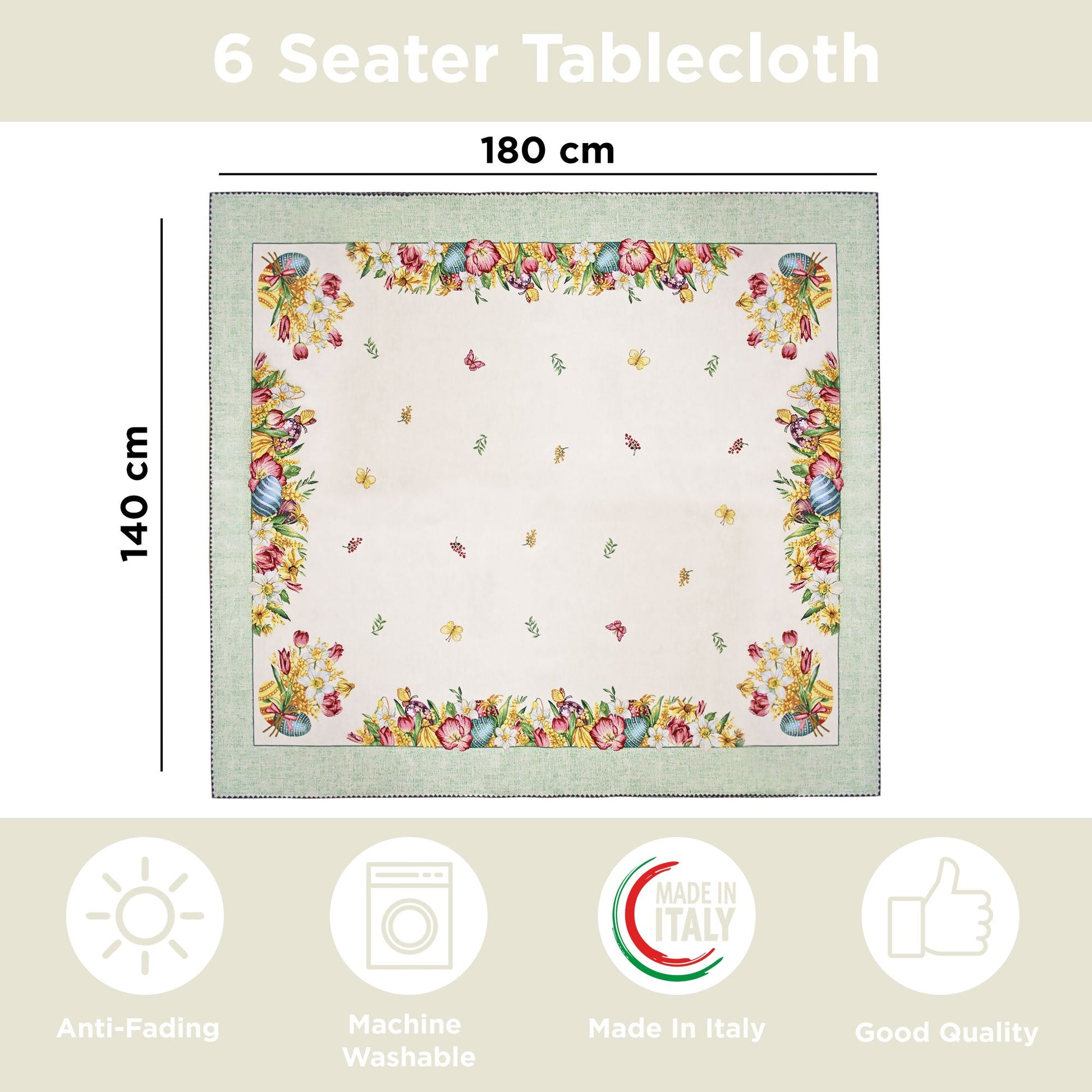 La fantasia incantevole con al centro foglie e farfalle e tutto intorno un motivo floreale e uova pasquali aggiunge un tocco festivo e unico alla tua tavola. Con dimensioni generose di 140x180cm, si adatta perfettamente a tavole da 6 posti, trasformando ogni pasto in un'occasione speciale.