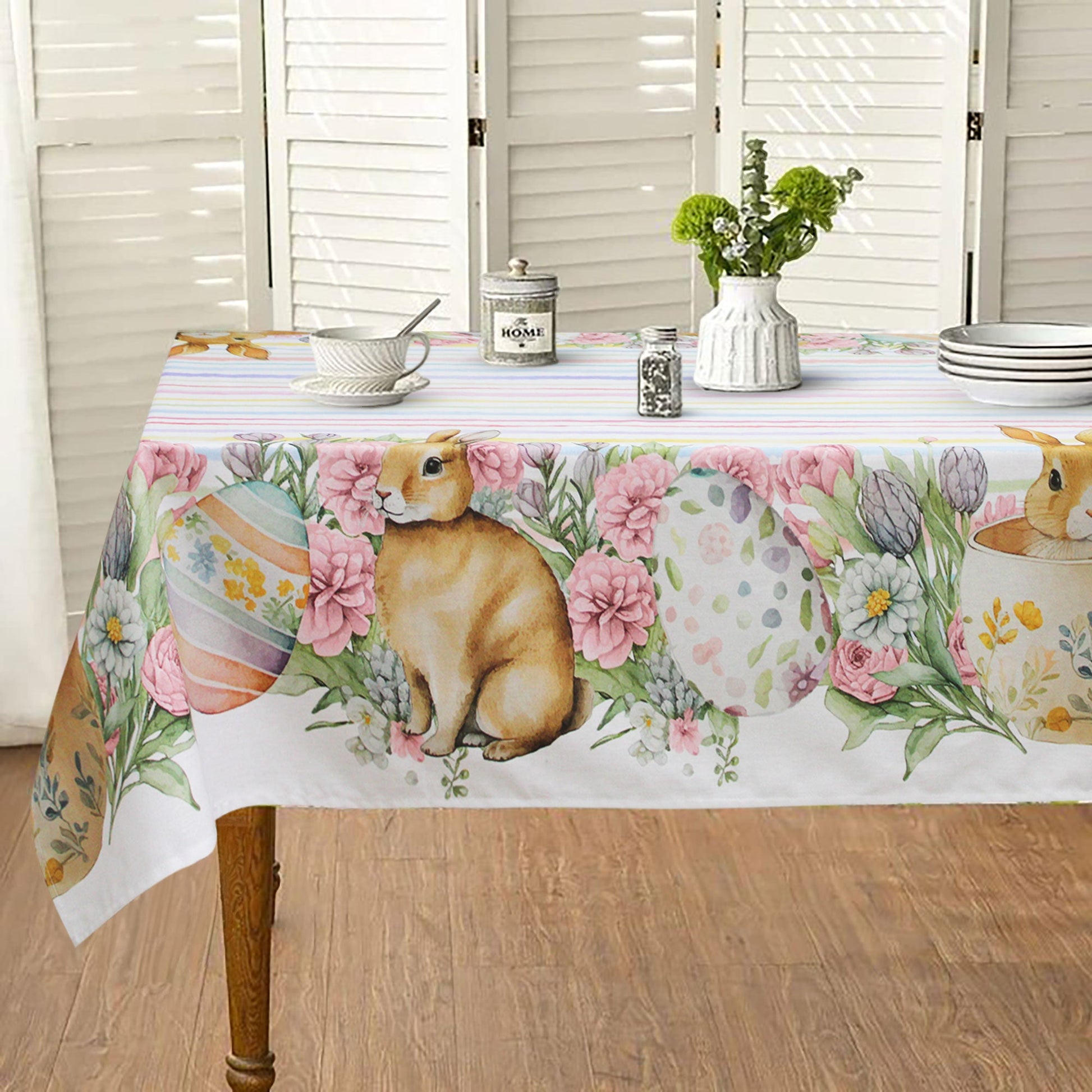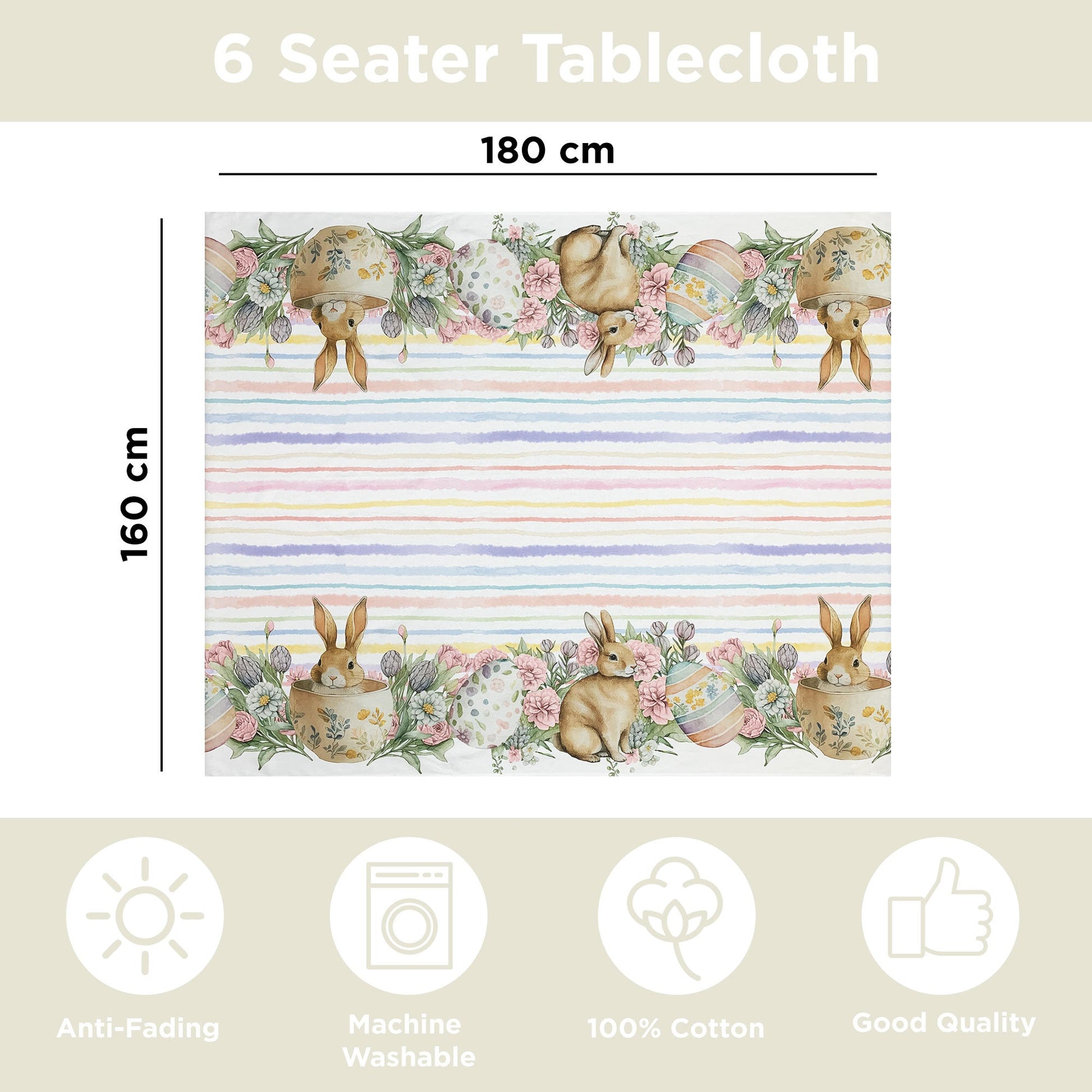 La stampa incantevole con conigli, righe e uova pasquali aggiunge un tocco festivo e unico alla tua tavola. Con dimensioni generose di 160x180cm, si adatta perfettamente a tavole da 6 posti, trasformando ogni pasto in un'occasione speciale.