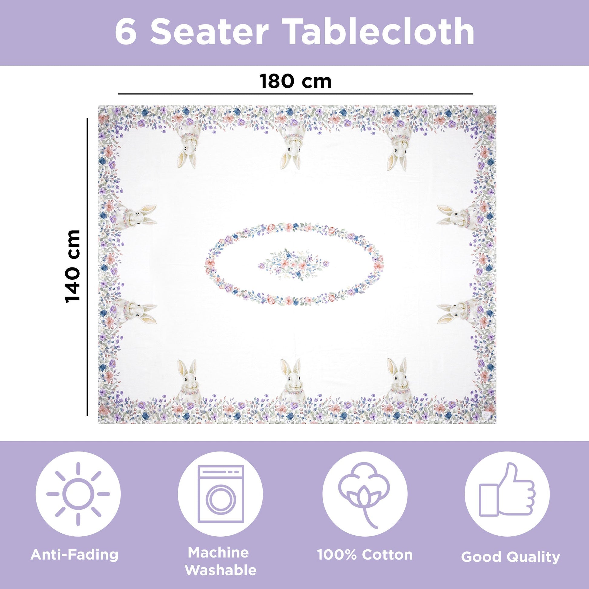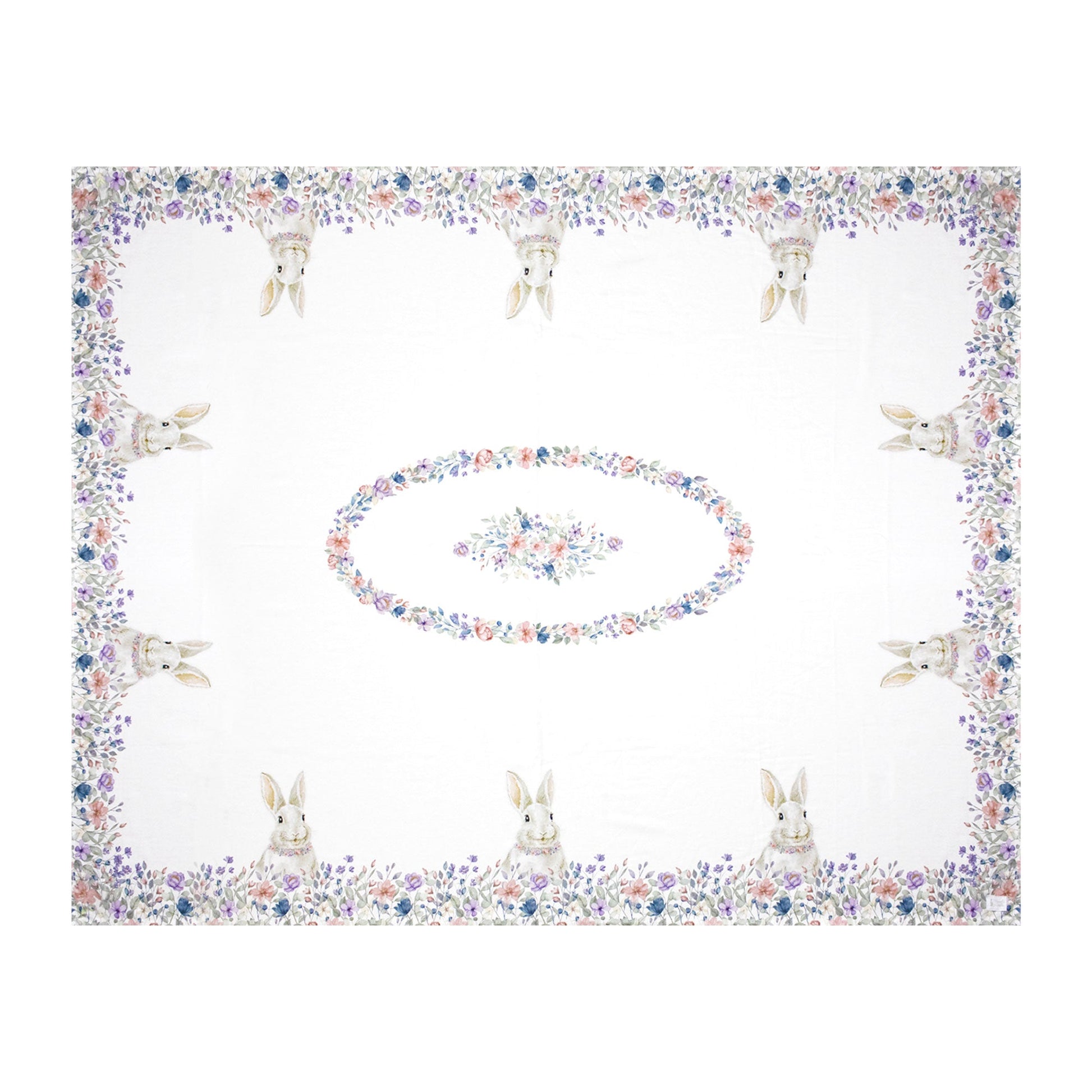 Il suo delicato motivo floreale, arricchito da adorabili conigli dai colori tenui, trasforma ogni momento a tavola in un'esperienza incantevole. Con dimensioni generose di 140x180cm, si adatta perfettamente a tavole da 6 posti, trasformando ogni pasto in un'occasione speciale.