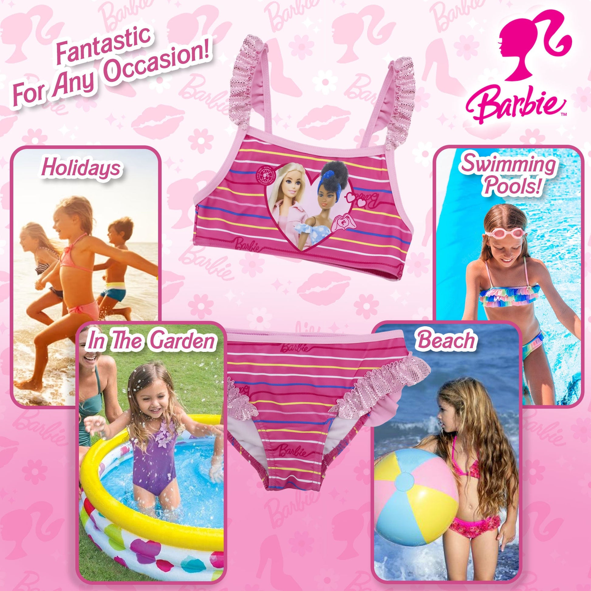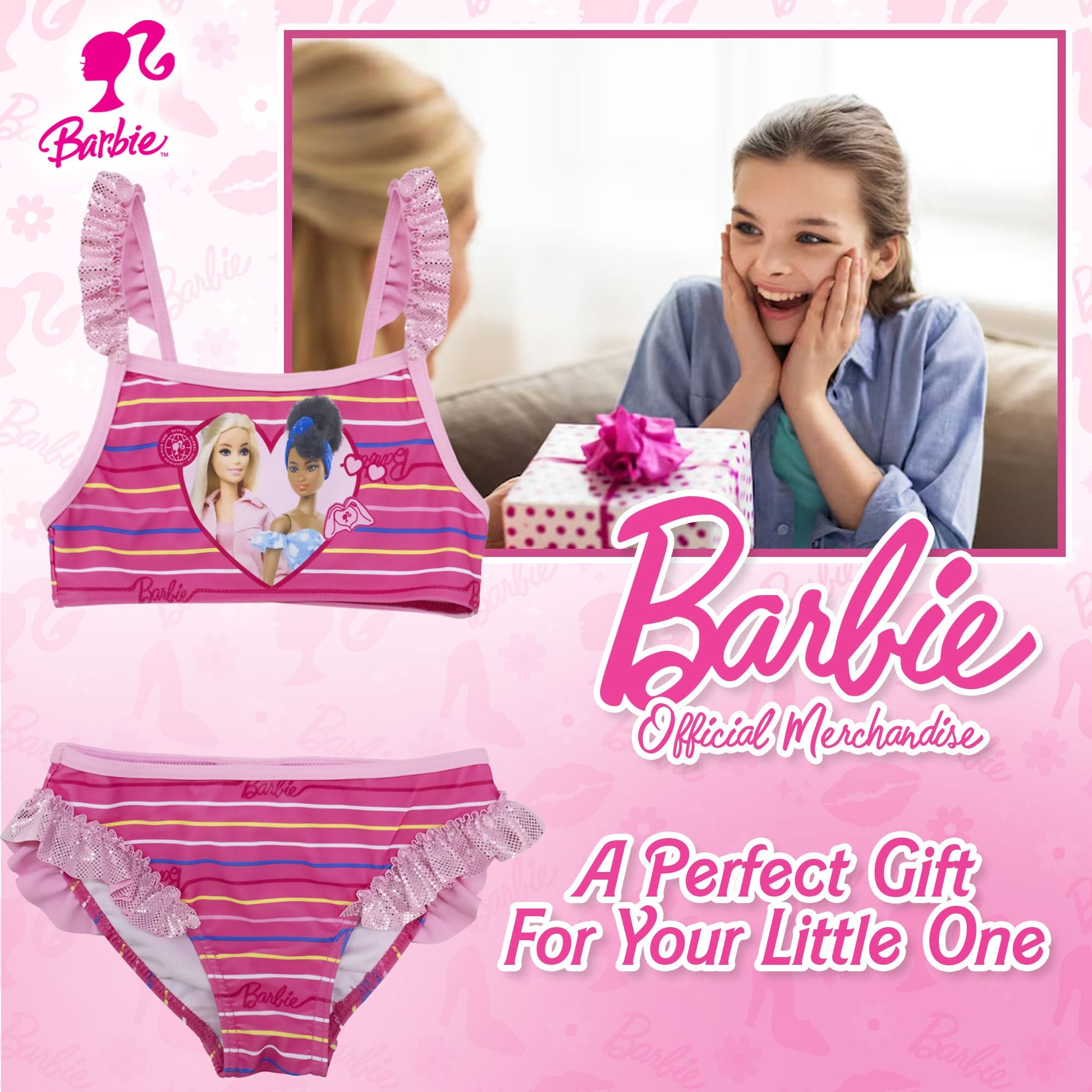 Prepara la tua piccola per l'estate con il nostro adorabile costume da bagno bikini 2 pezzi mare per bambina, ispirato all'iconica bambola della Mattel, Barbie. Questo grazioso costume da bagno sarà il centro dell'attenzione durante le giornate al mare o in piscina.