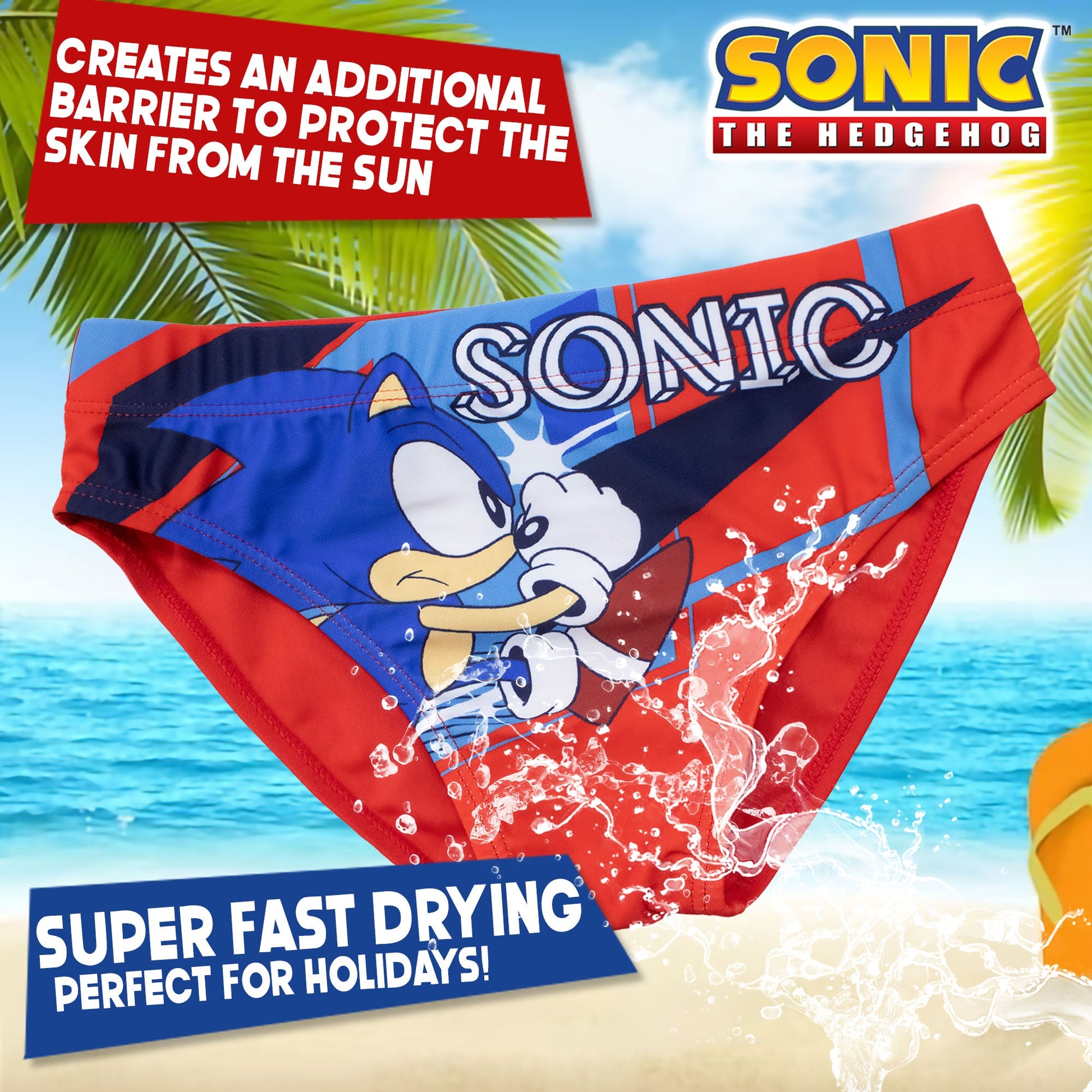 Costume da bagno per bambino modello slip con stampa di Sonic, ideale per i piccoli fan del riccio più veloce dei videogiochi. L'elastico in vita garantisce una vestibilità sicura e confortevole per giocare e nuotare in libertà.