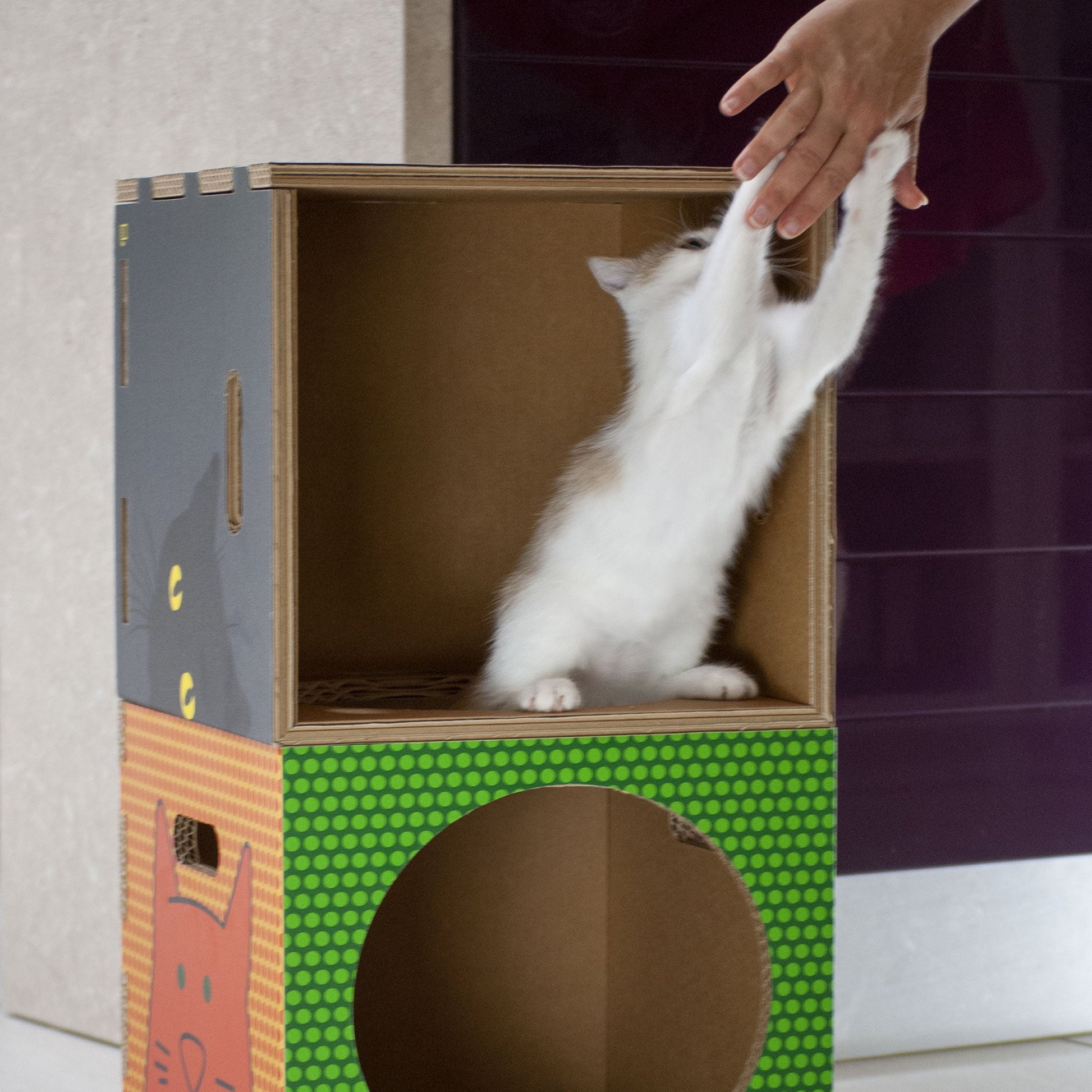 Combinando due cucce si ottiene una divertente palestra per gatti, ecologica e sicura. Fantastica come idea regalo per tutti gli amanti dei gatti.